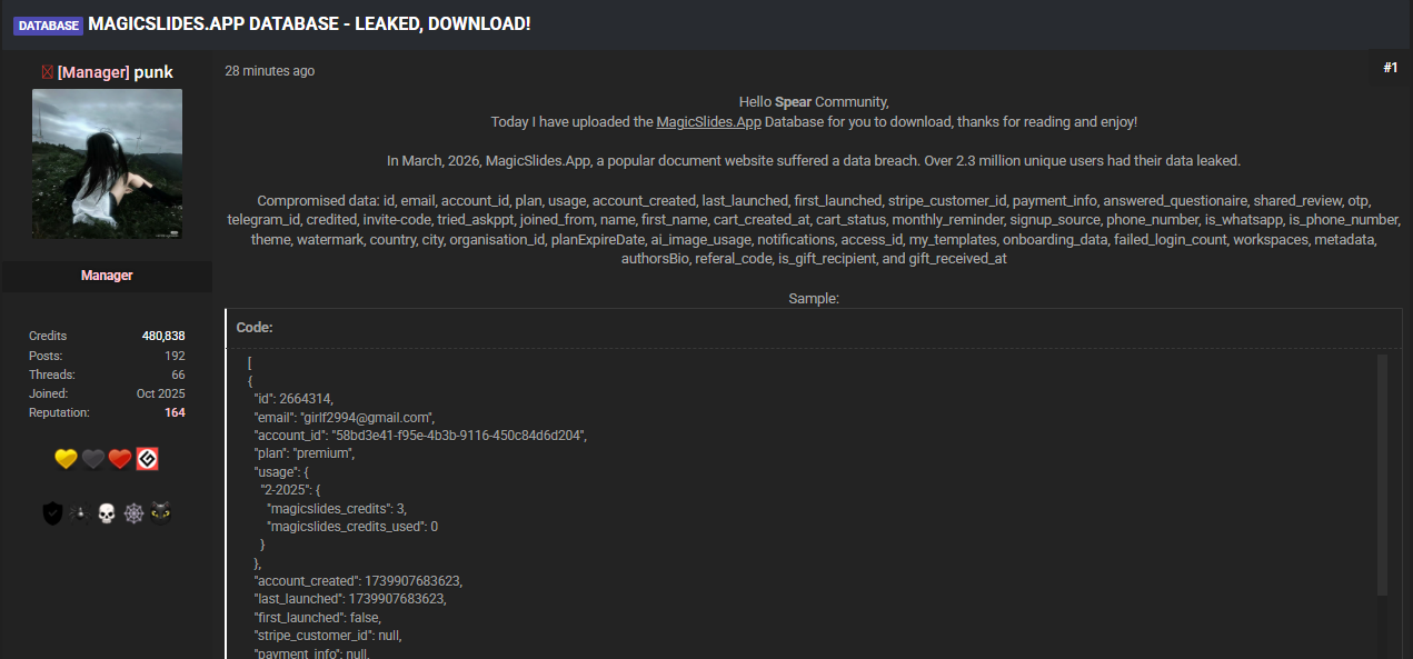 MagicSlides.App 发生数据泄露,大量用户信息已在黑客论坛曝光。