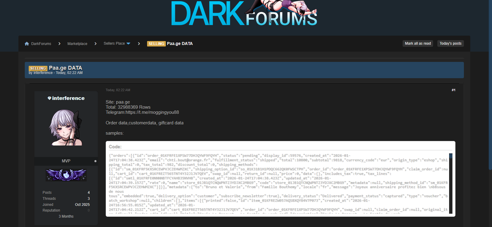疑似为创作者和商户提供个人主页链接聚合及电商解决方案的平台 Paa.ge(其基础设施与 Lama.co 相关联)据称发生数据泄露。一名威胁行为者已在平台挂售一个超大规模数据库,声称其中包含近 3300 万条数据记录。此次泄露事件波及所有使用 Paa.ge 基础设施的商铺,其中包括 “Envie Le Banquet”“Ephemera” 等商户。