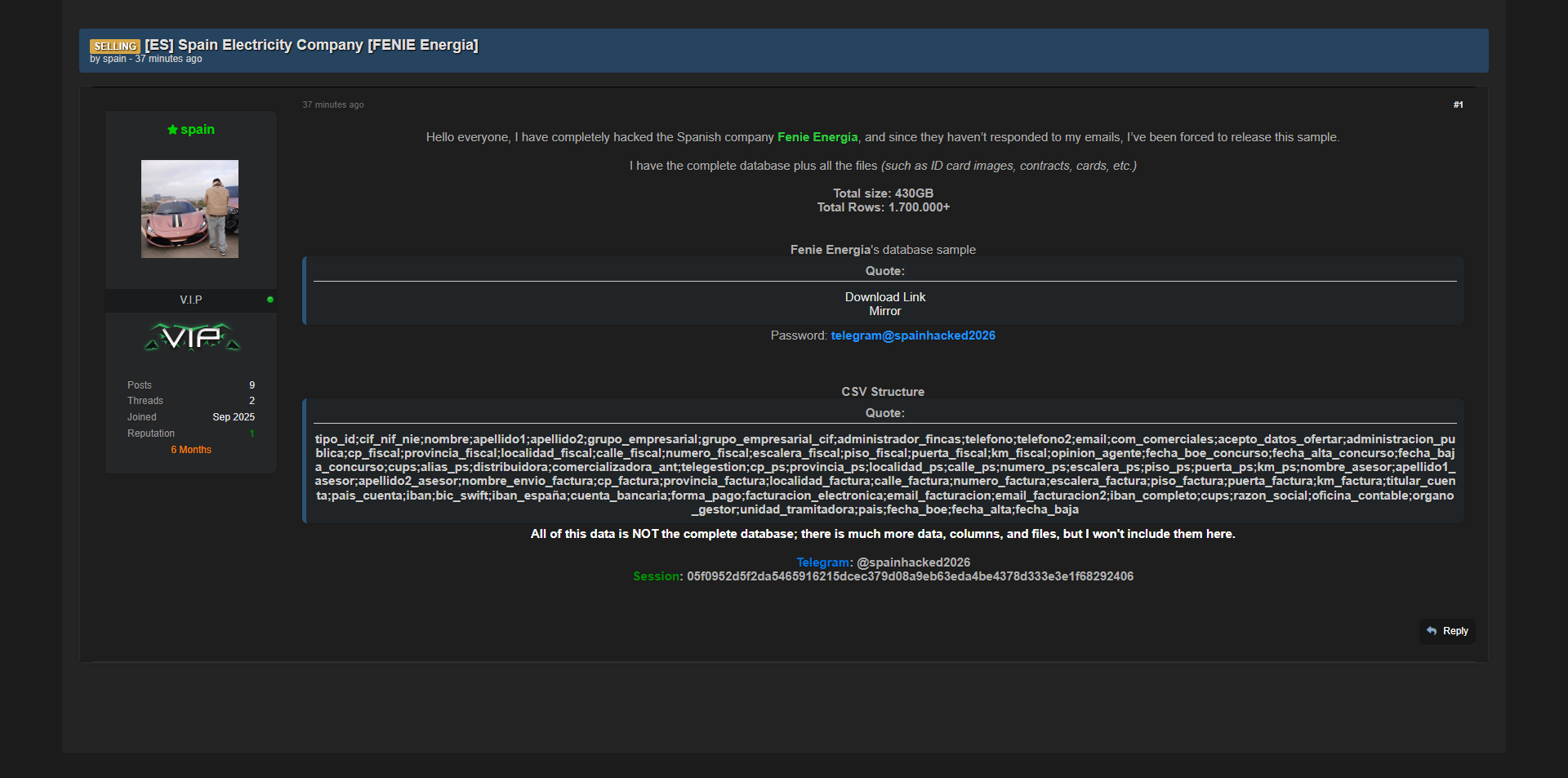 零零信安暗网新闻 | 威胁行为者黑客论坛曝光西班牙FENIE Energia电力公司170万客户数据
