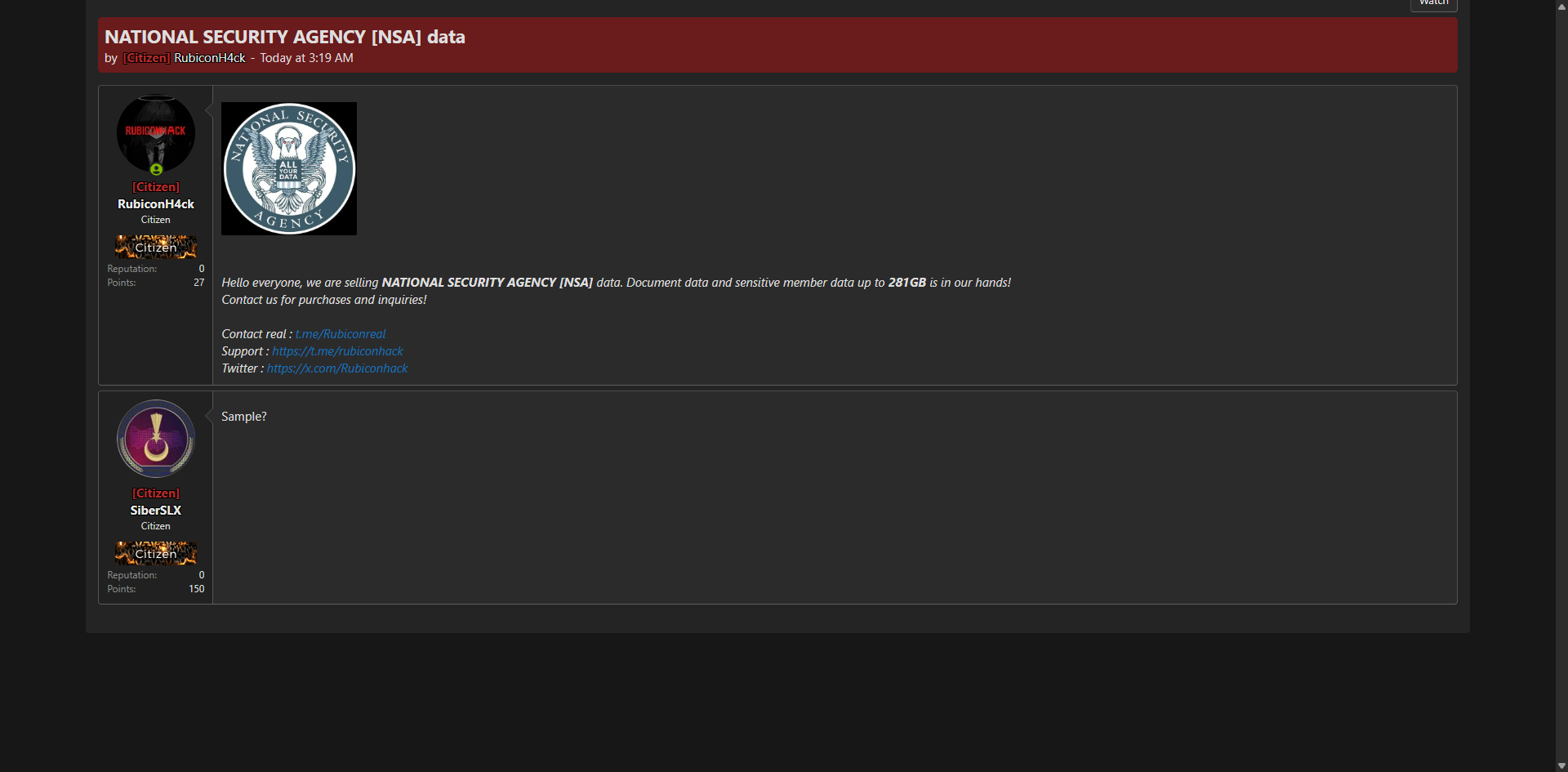 黑客论坛出售美国国家安全局(NSA)完整内部数据,总容量高达281GB,包含大量机密文档数据和敏感成员信息。