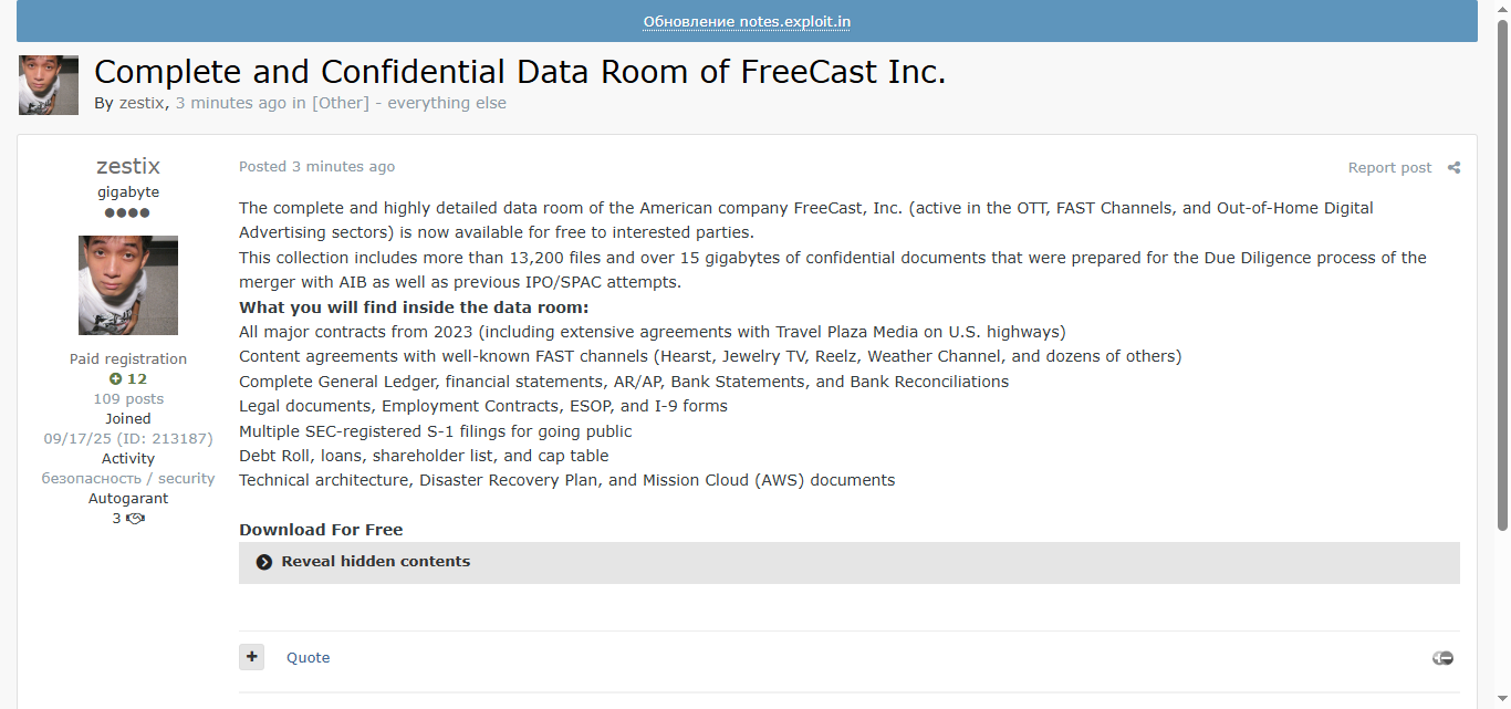 黑客论坛免费公开美国公司FreeCast Inc.(从事OTT、FAST频道及户外数字广告业务)的完整机密数据室,包含超过13,200个文件,总容量超过15GB。这些文件是为与AIB的并购尽职调查以及此前IPO/SPAC尝试准备的核心商业资料。