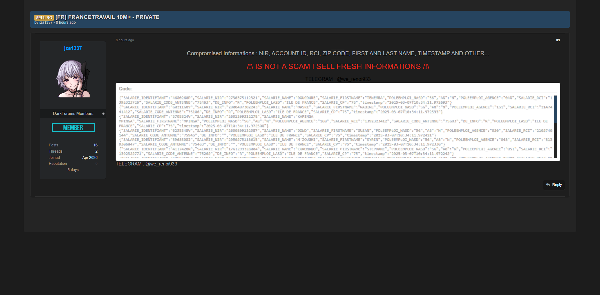 零零信安暗网新闻 | 法国FranceTravail超1000万条求职者私人数据泄露