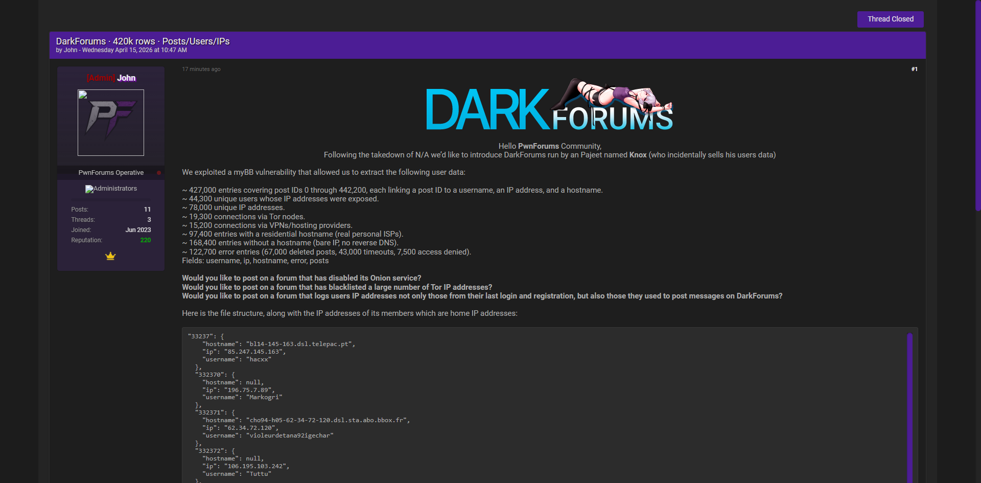此次DarkForums论坛自我数据泄露暴露了大量用户真实IP地址和发帖记录,风险极高,可能导致用户被精准追踪、执法调查或针对性攻击。论坛用户需立即警惕个人信息外泄风险。