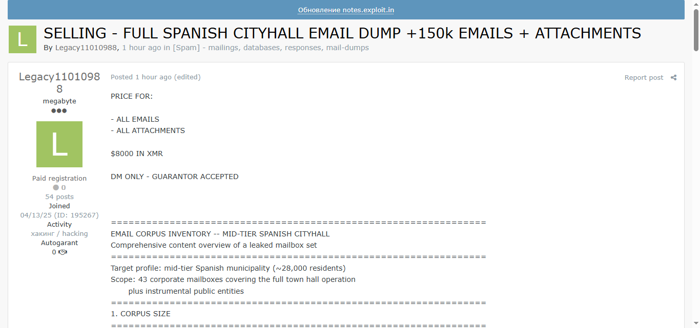 黑客论坛出售西班牙某中型市政厅(约2.8万居民规模)完整邮箱转储,包含约15万封邮件及大量附件,覆盖43个企业邮箱,涉及市政厅全部运营及公共实体通信记录。