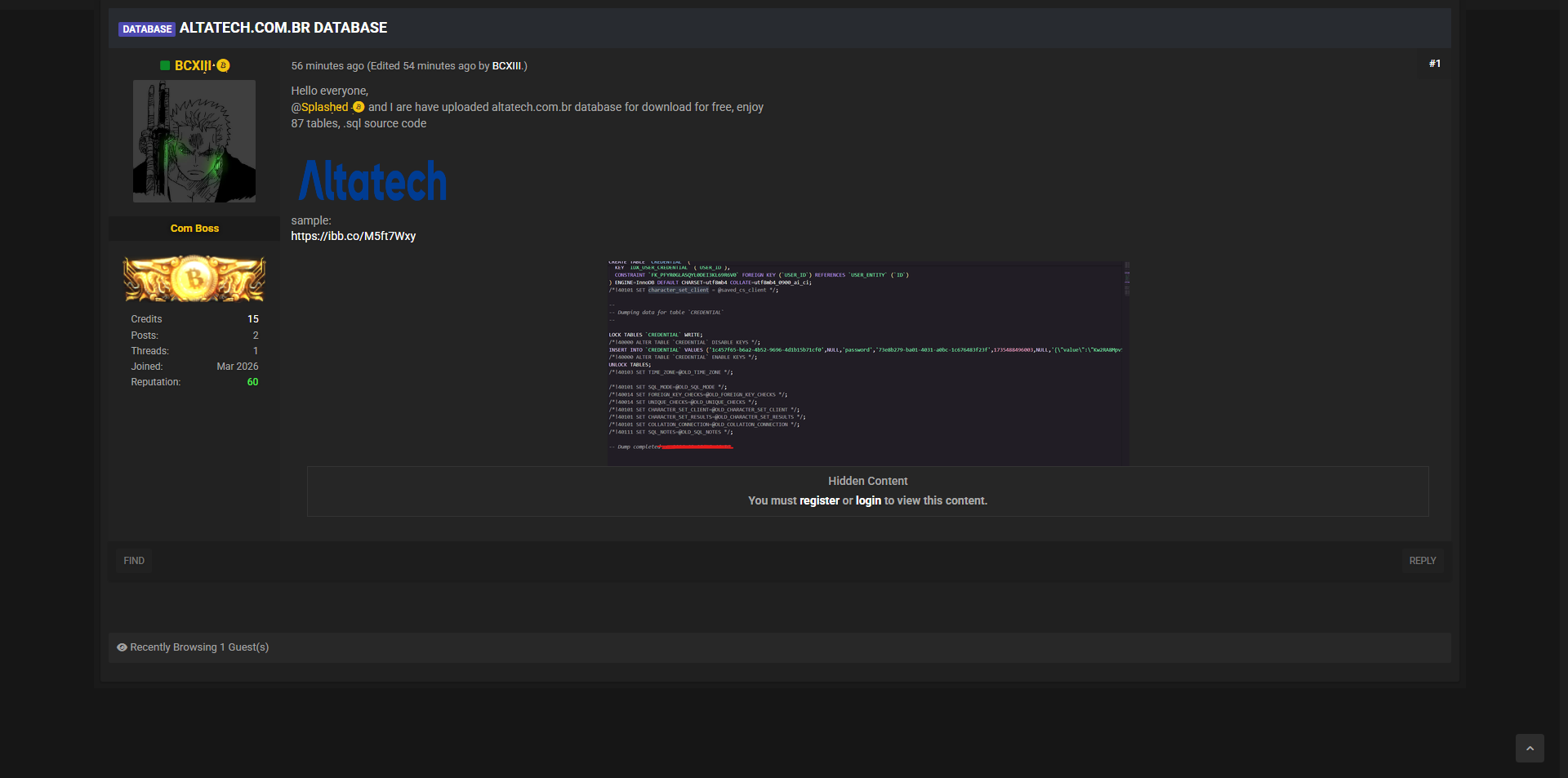 威胁行为者BCXIII(与Splashed合作)在黑客论坛宣称,已获取巴西科技公司Altatech.com.br的完整数据库。该数据库包含87张表,以SQL源代码格式发布。