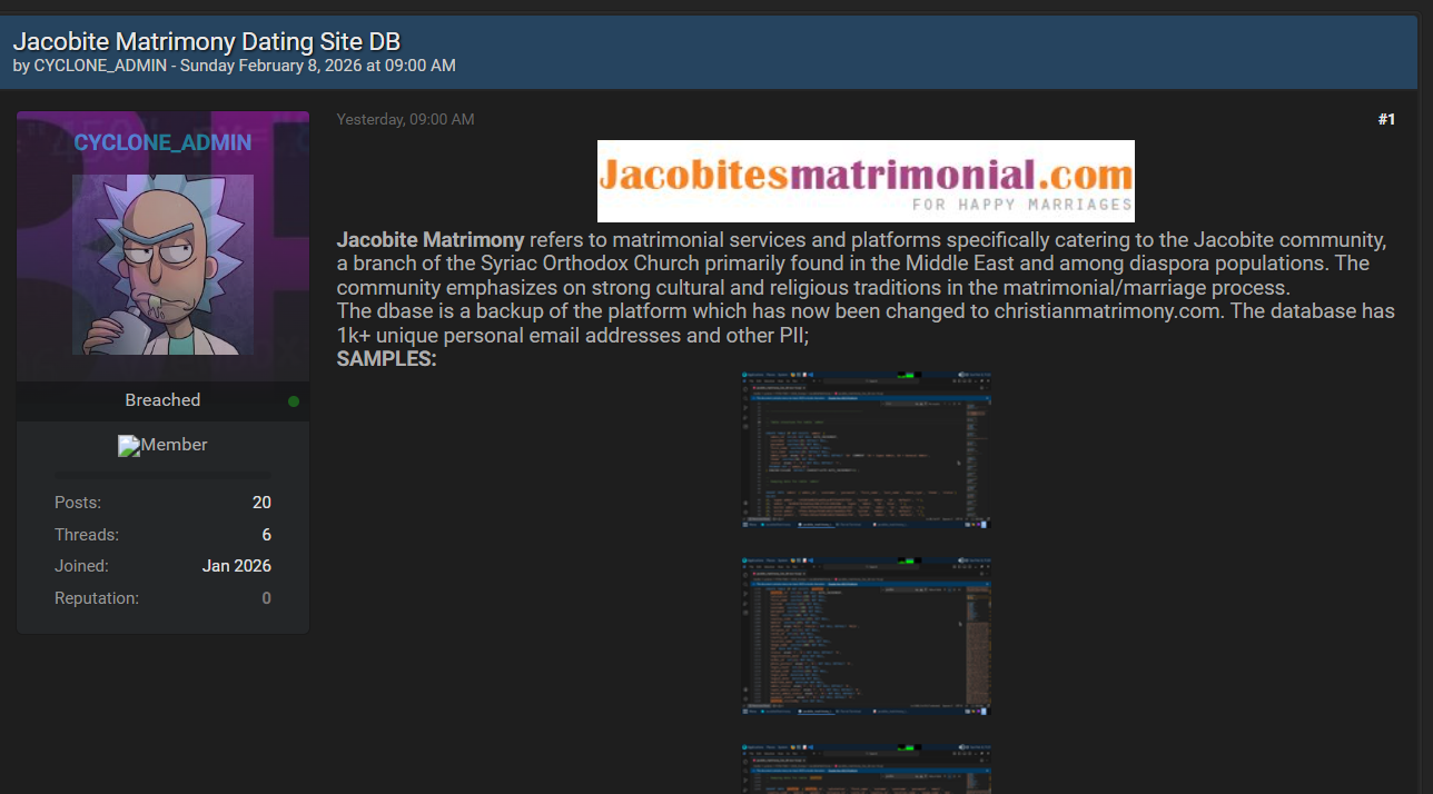 雅各比派婚姻网(一个面向雅各比派叙利亚基督教社群的小众婚恋平台)疑似其数据库被曝光在某黑客论坛。该平台专注于在婚恋匹配过程中传承文化与宗教传统,据称是当前运营域名 christianmatrimony.com 的前身或关联平台。泄露文件为 2014 年末的历史 SQL 数据库备份,意味着此次泄露的是早期用户数据,而非当前在用系统的安全漏洞所致。