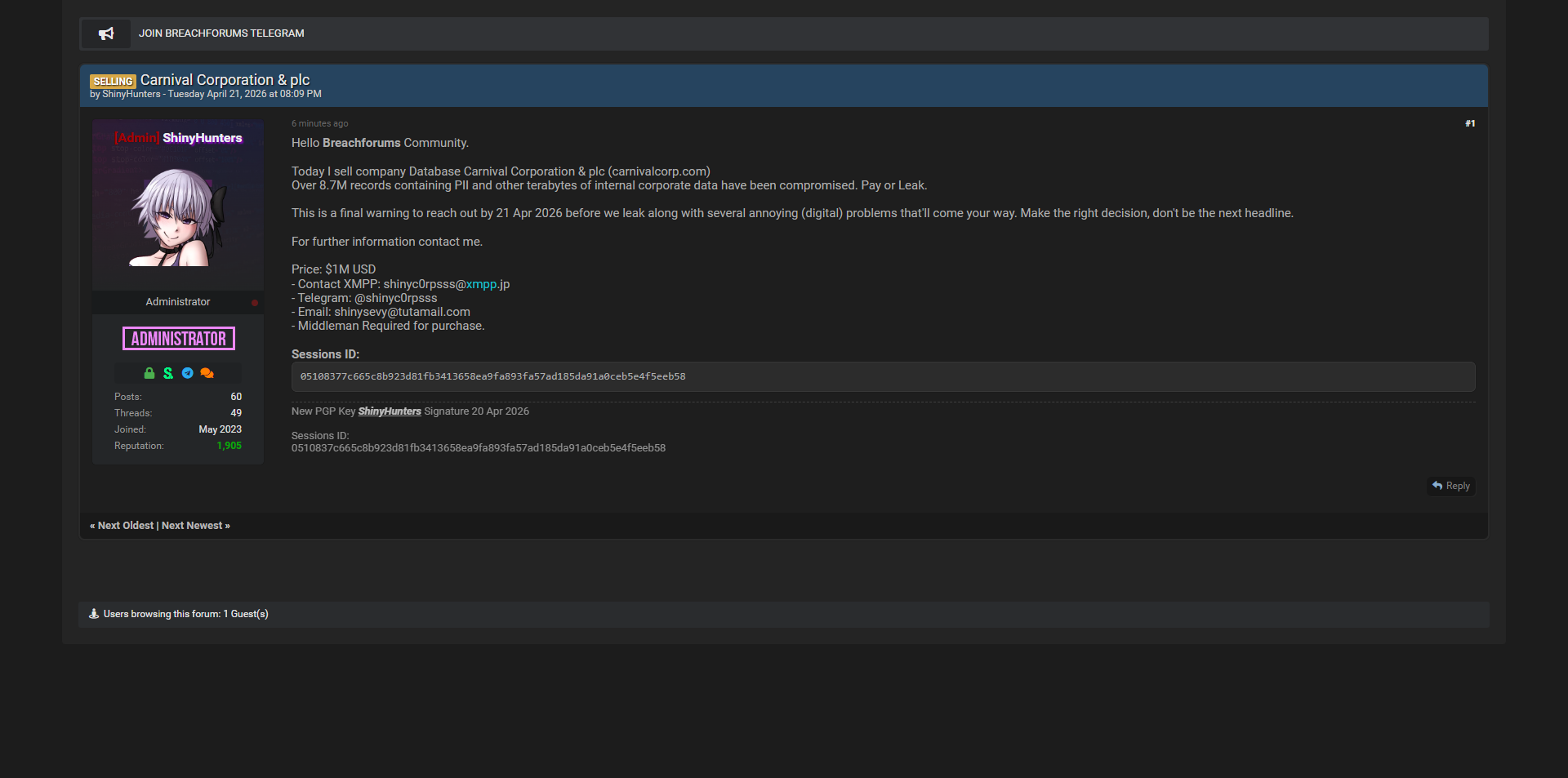 黑客组织ShinyHunters在暗网论坛发布美国邮轮巨头Carnival Corporation & plc(carnivalcorp.com)完整数据库,共870万条记录,包含大量个人身份信息(PII)及公司内部核心数据。