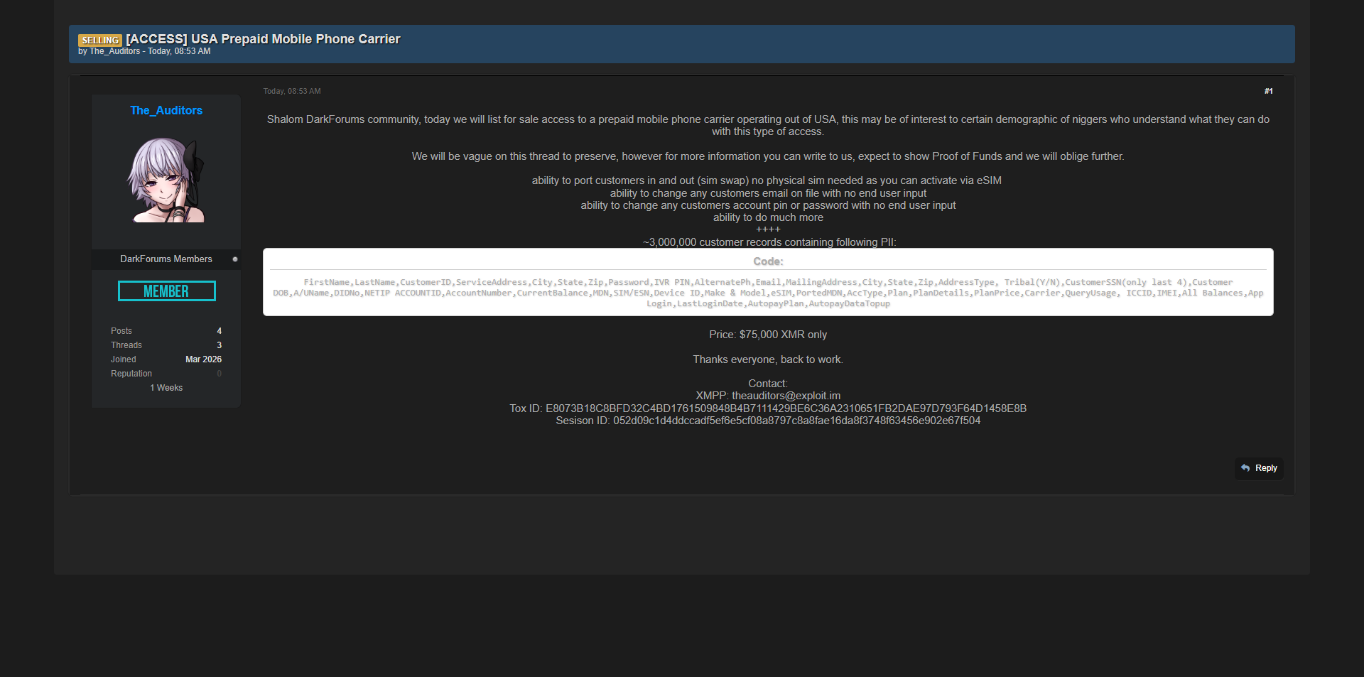 黑客论坛出售美国某预付手机运营商后台完整访问权限,包含约300万客户记录,攻击者可实现SIM Swap(eSIM激活)、无需用户确认直接修改客户邮箱、账户PIN码及密码等高危操作。