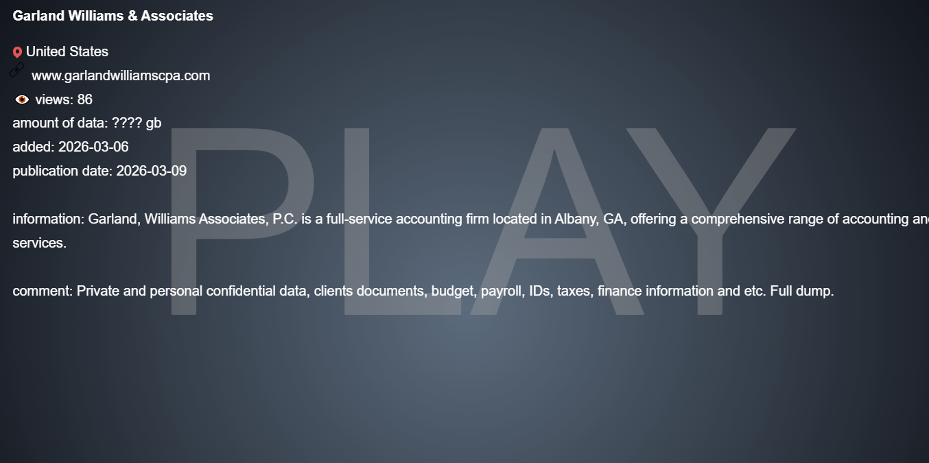 美国一家位于佐治亚州奥尔巴尼的全方位会计服务事务所Garland, Williams & Associates, P.C.发生数据泄露。该事务所提供全面会计、税务、薪资、审计等服务,其私有与个人机密数据被威胁行为者在黑客论坛上公开。