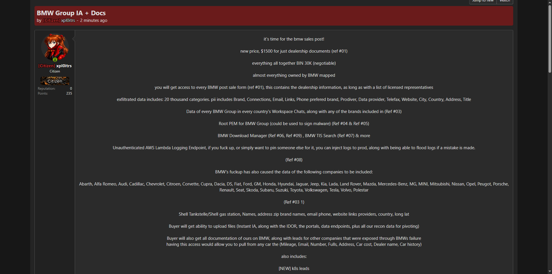 威胁行为者据称在黑客论坛上出售BMW Group内部系统访问权限及海量文档数据,包括所有BMW经销商的销售后表单、授权代表列表,以及超过2万个数据类别。此次泄露还意外包含了多家其他主流汽车品牌的数据。