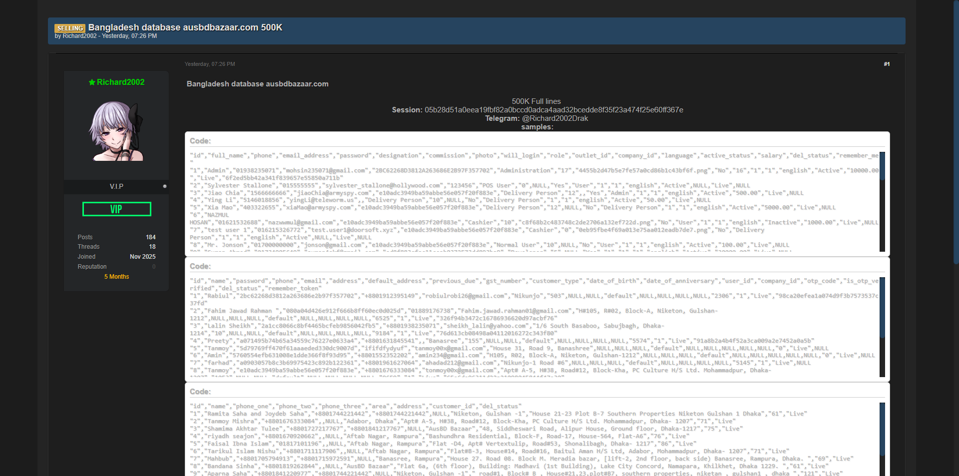 黑客论坛曝光孟加拉国ausbdbazaar.com平台的完整数据库,共50万条用户记录,泄露了完整姓名、电话号码、邮箱地址、密码、职位、佣金、地址等敏感信息。