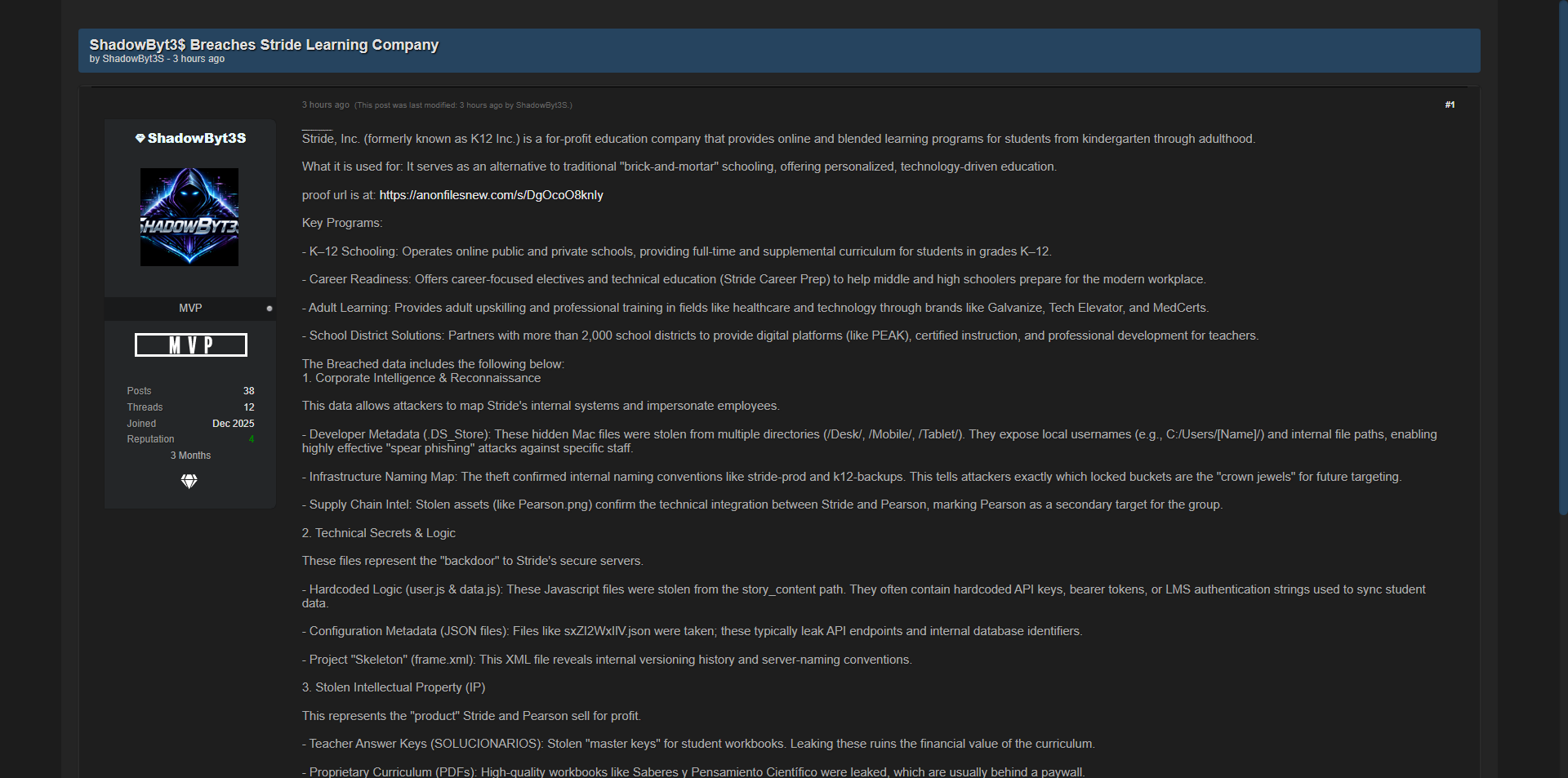 黑客ShadowByt3$入侵美国知名在线教育平台Stride, Inc.(前K12 Inc.),泄露大量内部开发元数据、硬编码API密钥、配置文件、教师答案密钥及专有课程教材等核心敏感信息。