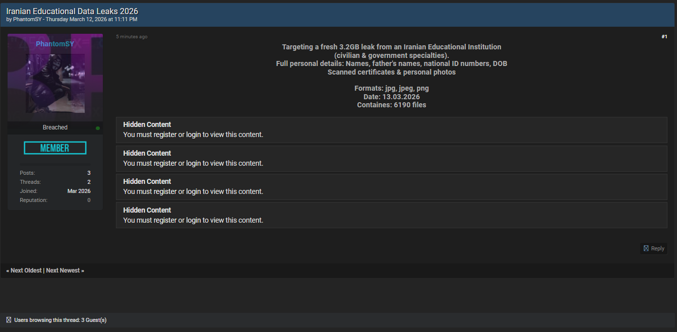 近期,威胁行为者在黑客论坛上发布信息,声称已获取伊朗教育系统的大量敏感数据。威胁行为者暗示此次泄露涉及教育领域的机密信息,可能包括学生和教职员工的个人资料、学术记录及其他敏感文件。