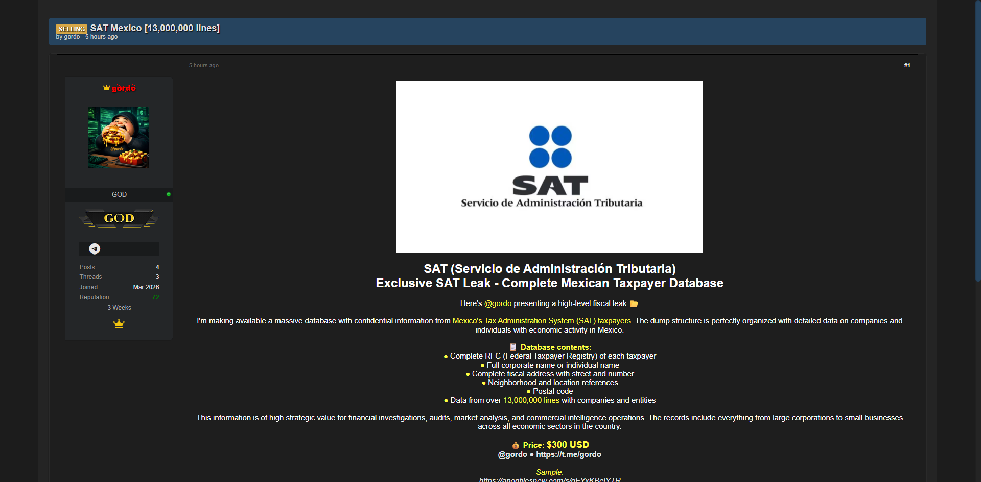 黑客论坛上出售墨西哥税务局(SAT)1300万条纳税人数据库,包含RFC联邦纳税人登记号、公司或个人完整名称、完整税务地址、社区位置参考、邮政编码以及经济活动数据等高度敏感税务信息。