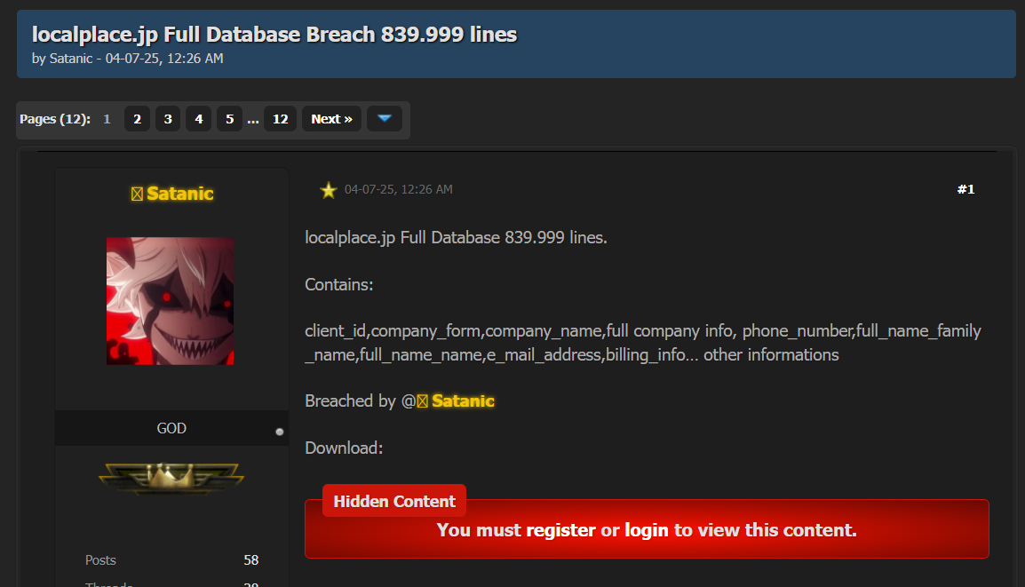 黑客论坛上曝光了日本localplace.jp网站的完整数据库,包含客户ID、公司形式、公司名称、完整公司信息、电话号码、姓名、邮箱地址、账单信息等敏感商业数据。