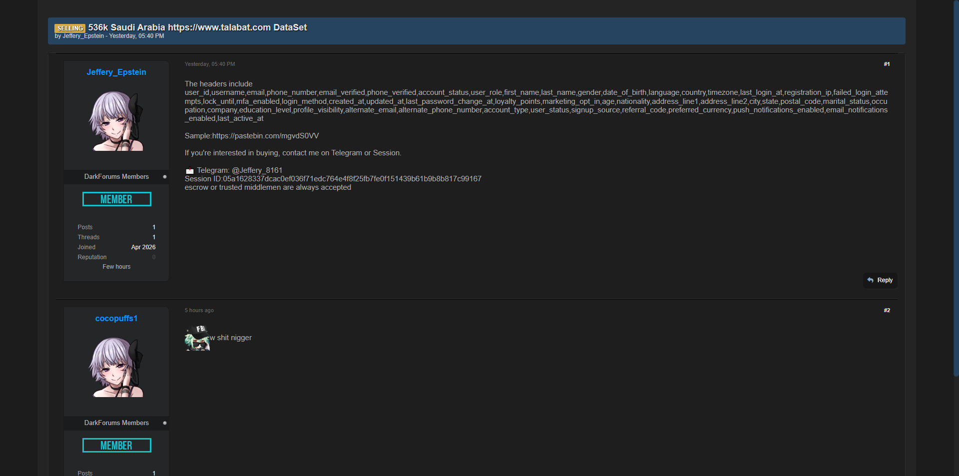 黑客论坛出售沙特阿拉伯知名外卖平台Talabat.com用户数据集,总计53.6万条完整用户记录,包含大量沙特用户个人信息及账户详情。
