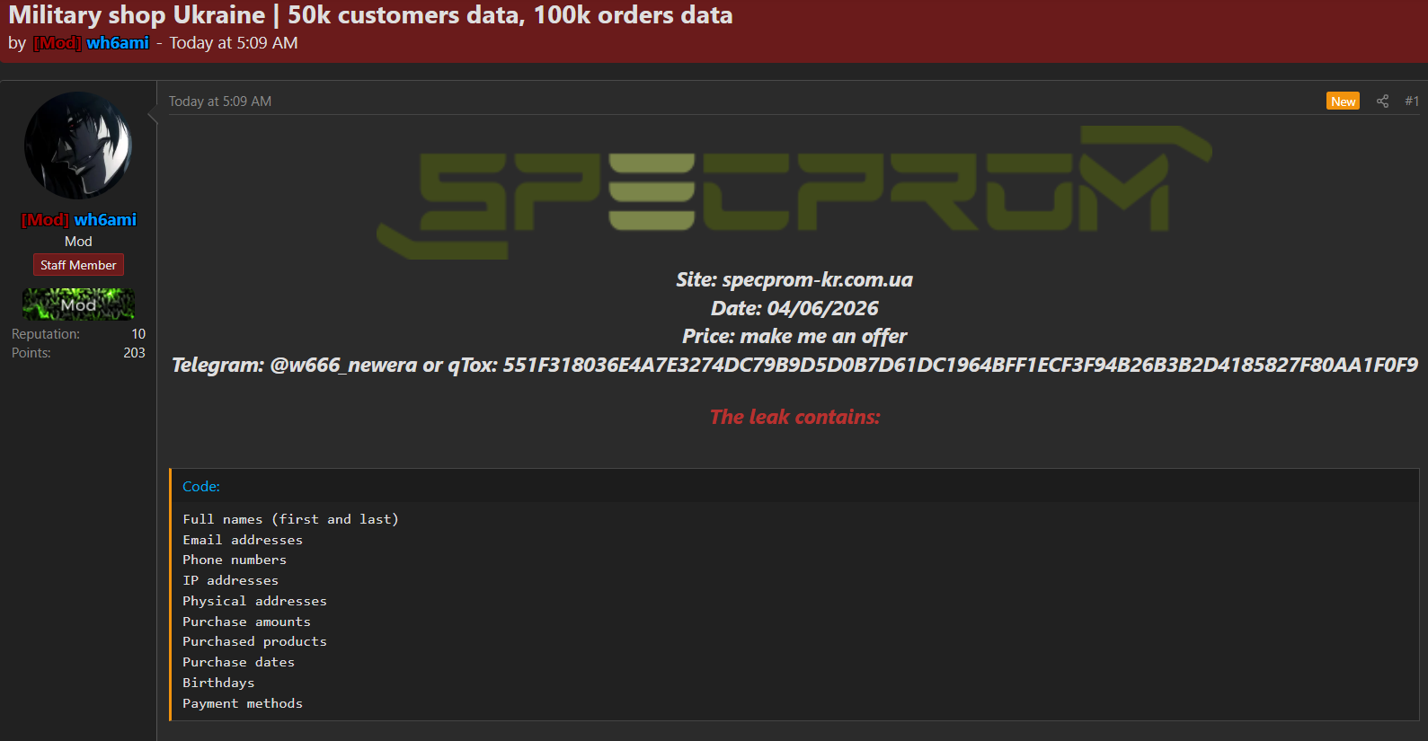 零零信安暗网新闻 | 乌克兰军事用品商店Specprom 5万客户+10万订单数据泄露