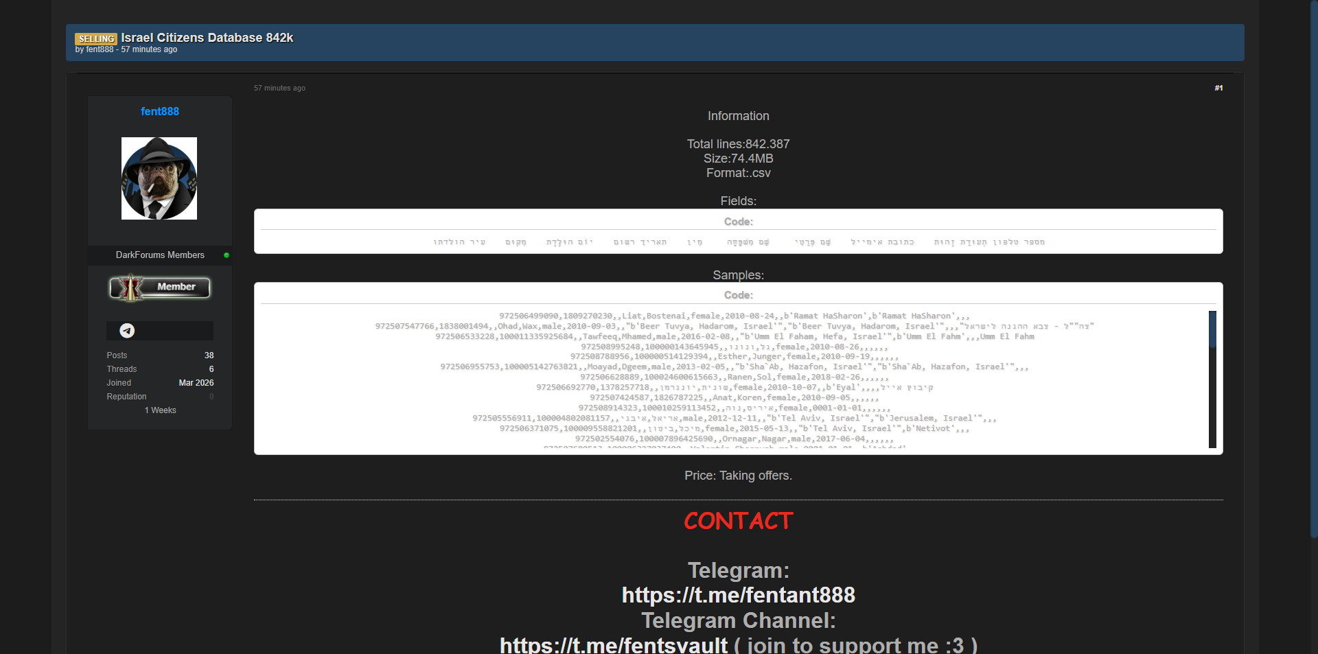 威胁行为者在黑客论坛上发布了以色列公民数据库,包含约84.2万条记录。该数据库为CSV格式,涵盖大量以色列民众的敏感个人信息。