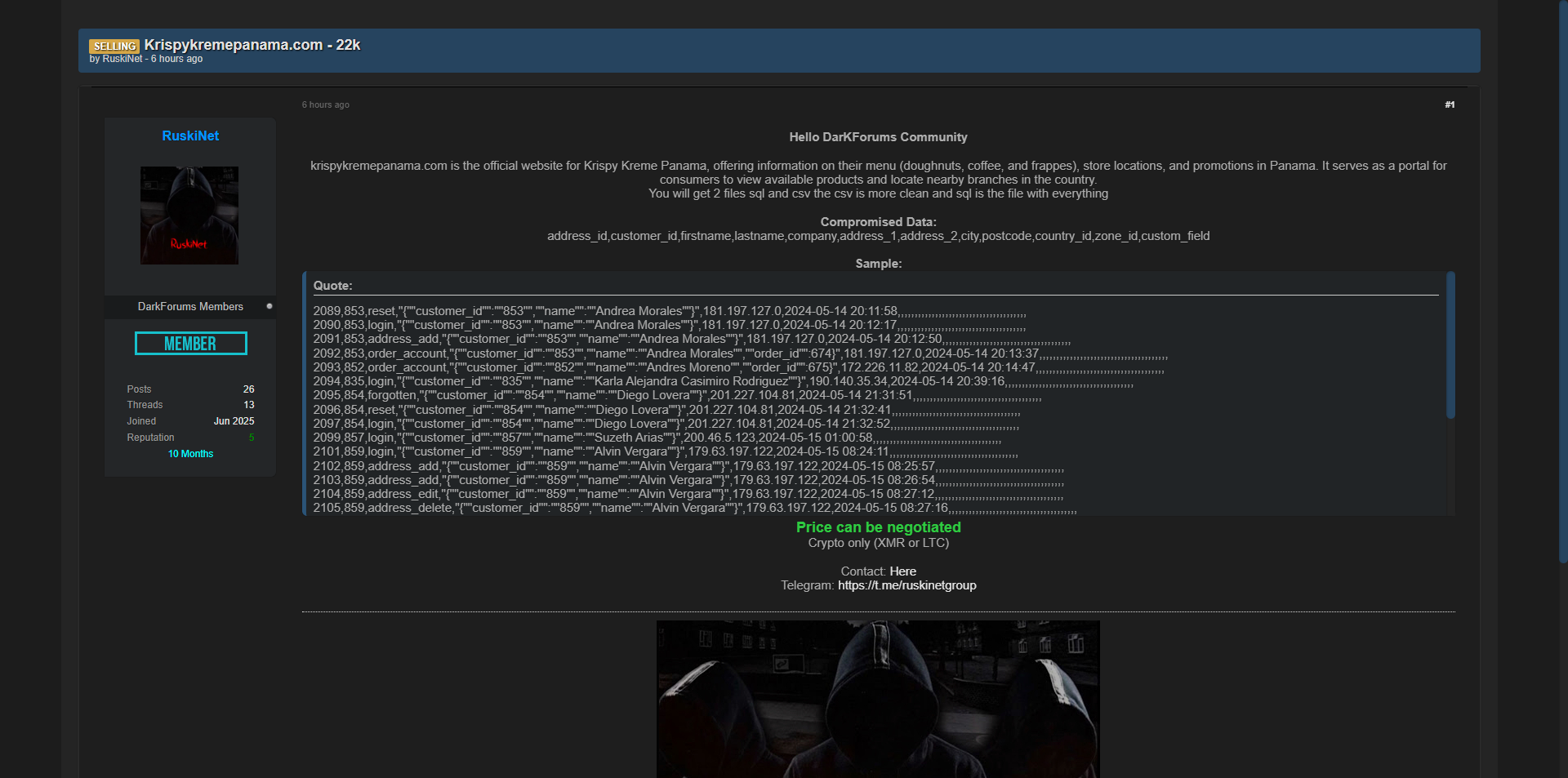 黑客论坛曝光巴拿马Krispy Kreme(krispykremepanama.com)官方客户数据库,共2.2万条记录。该网站为消费者提供甜甜圈、咖啡等产品信息、门店位置及促销活动,泄露文件包含SQL与CSV格式完整客户数据。