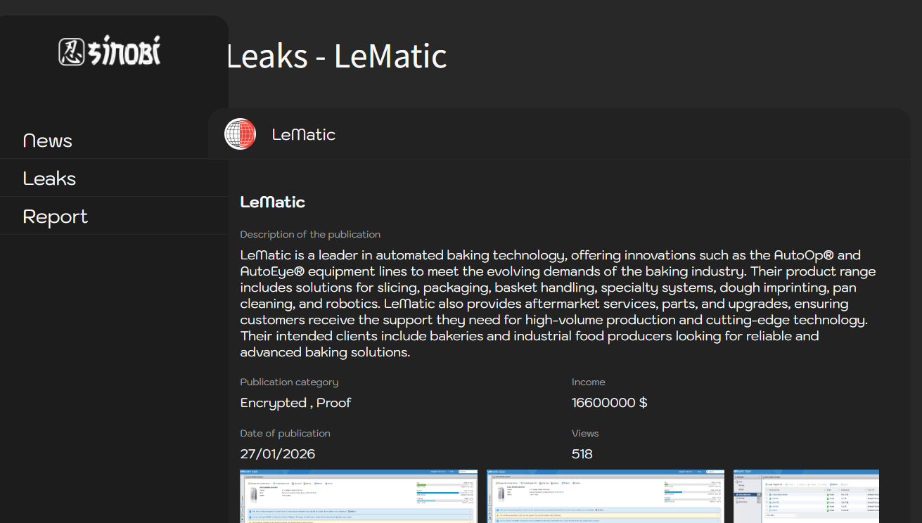 西诺比勒索软件团伙宣称入侵了自动化烘焙技术领域龙头企业莱马蒂克(LeMatic),该公司旗下拥有 AutoOp®、AutoEye® 等多款核心自动化设备产品线。莱马蒂克总部位于美国密歇根州杰克逊市,为全球各地的烘焙企业及食品生产商提供切片、包装环节的工业解决方案与自动化机器人技术。目前该勒索软件团伙已将莱马蒂克列入其暗网数据泄露站点,这一行为标志着该设备制造商的内部基础设施遭遇严重入侵。