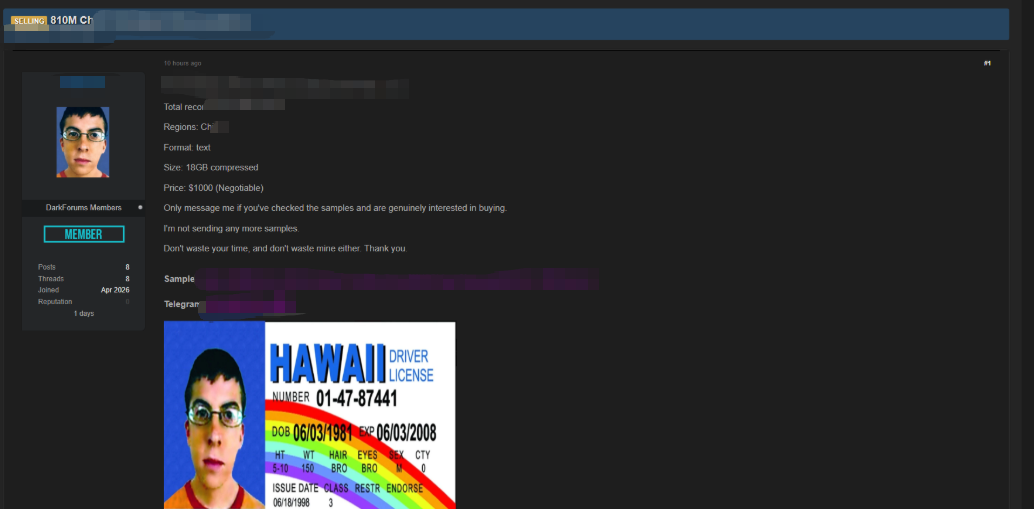 黑客论坛曝光某国购物配送地址完整数据库,包含810百万条记录,覆盖全国购物收货人姓名、电话号码及详细配送地址等信息。