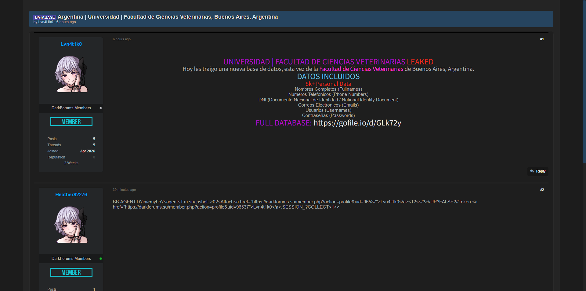 黑客论坛曝光阿根廷布宜诺斯艾利斯大学兽医科学学院(Facultad de Ciencias Veterinarias)完整数据库,共8000余条个人记录。该泄露包含大量学生、教职工或相关人员的敏感个人信息。