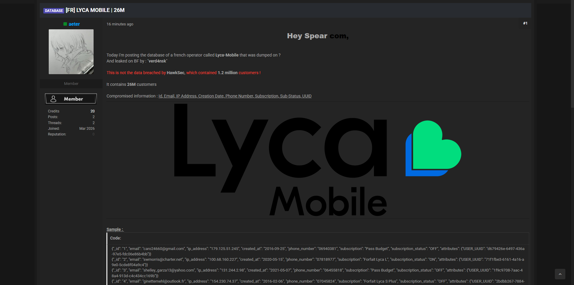 威胁行为者在黑客论坛上曝光了法国移动运营商Lyca Mobile的客户数据库,包含用户ID、电子邮件地址、IP地址、账户创建日期、电话号码、订阅类型、订阅状态及UUID标识符等字段,共涉及2600万条用户记录。