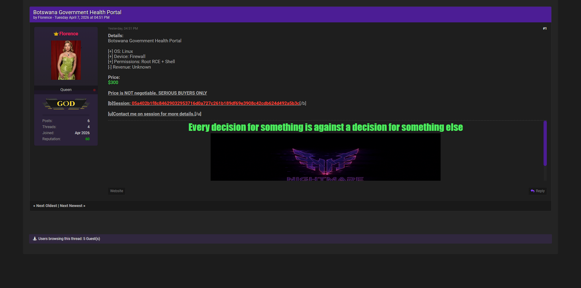 黑客论坛曝光博茨瓦纳政府健康门户系统,攻击者已成功获取Linux防火墙Root RCE及Shell完整控制权限,可直接接管全国医疗数据与关键基础设施。