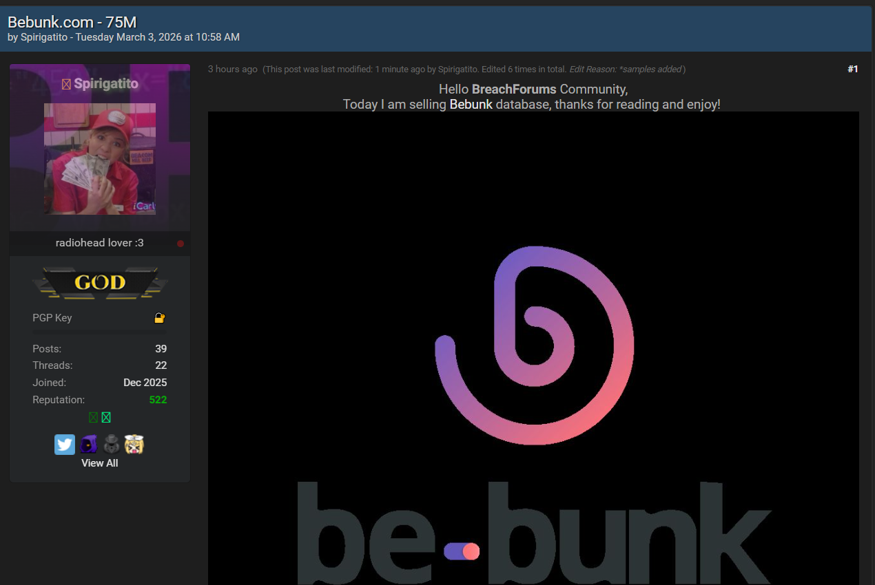 一名威胁行为者在黑客论坛上宣布出售 Bebunk.com 的完整数据库,声称包含75百万条记录,该平台作为法国太平洋地区(Outre-Mer)的本土新银行服务,提供账户开设、Visa卡和移动支付功能,主要服务当地居民。此次泄露于2026年3月3日曝光,威胁行为者已添加样本,并通过论坛进行售卖。