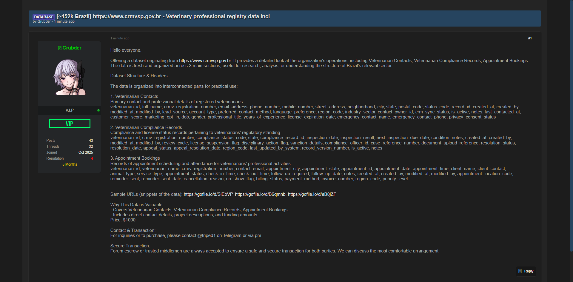 黑客论坛上出售巴西兽医专业注册委员会(crmvsp.gov.br)的完整数据库,包含兽医姓名、注册编号、电子邮件地址、电话号码、详细住址、执照到期日期、合规记录、预约预订信息等字段,共约45.2万条记录。