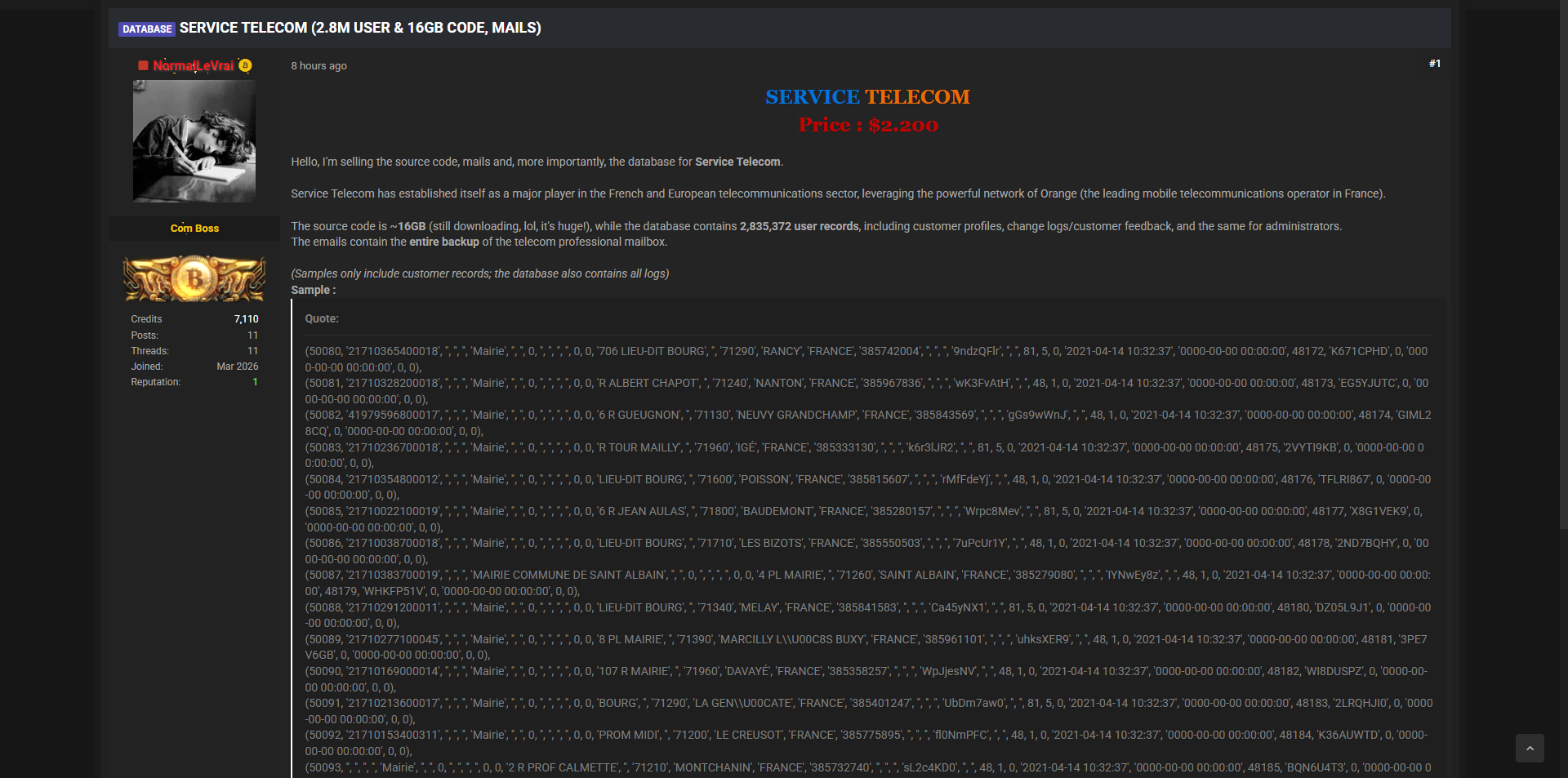 零零信安暗网新闻 | 法国Service Telecom电信公司280万用户数据及16GB源代码泄露