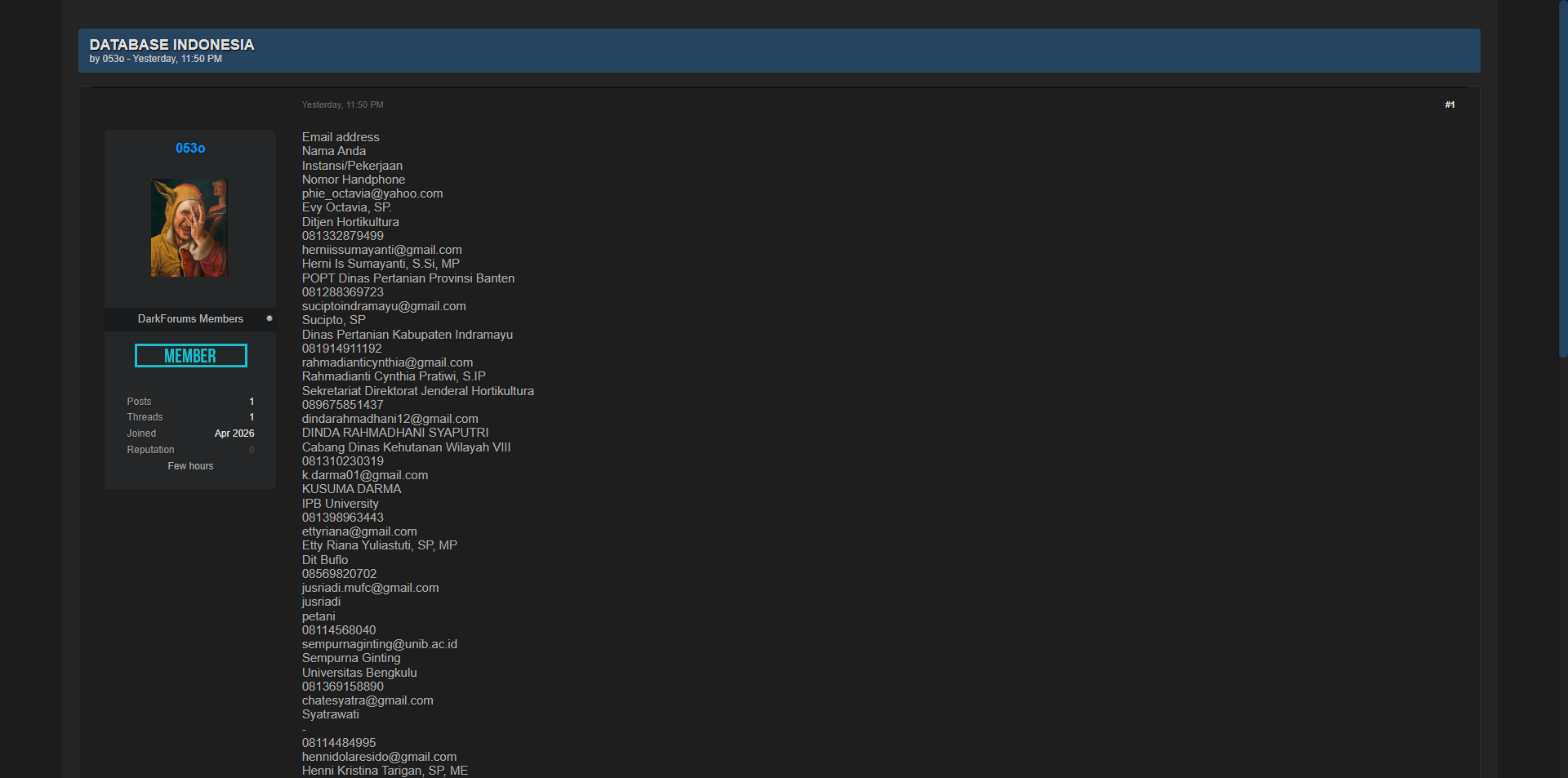 黑客论坛曝光印度尼西亚完整数据库,包含大量政府及农业部门官员、员工个人信息,涵盖姓名、邮箱、手机号码及单位职位等敏感记录。