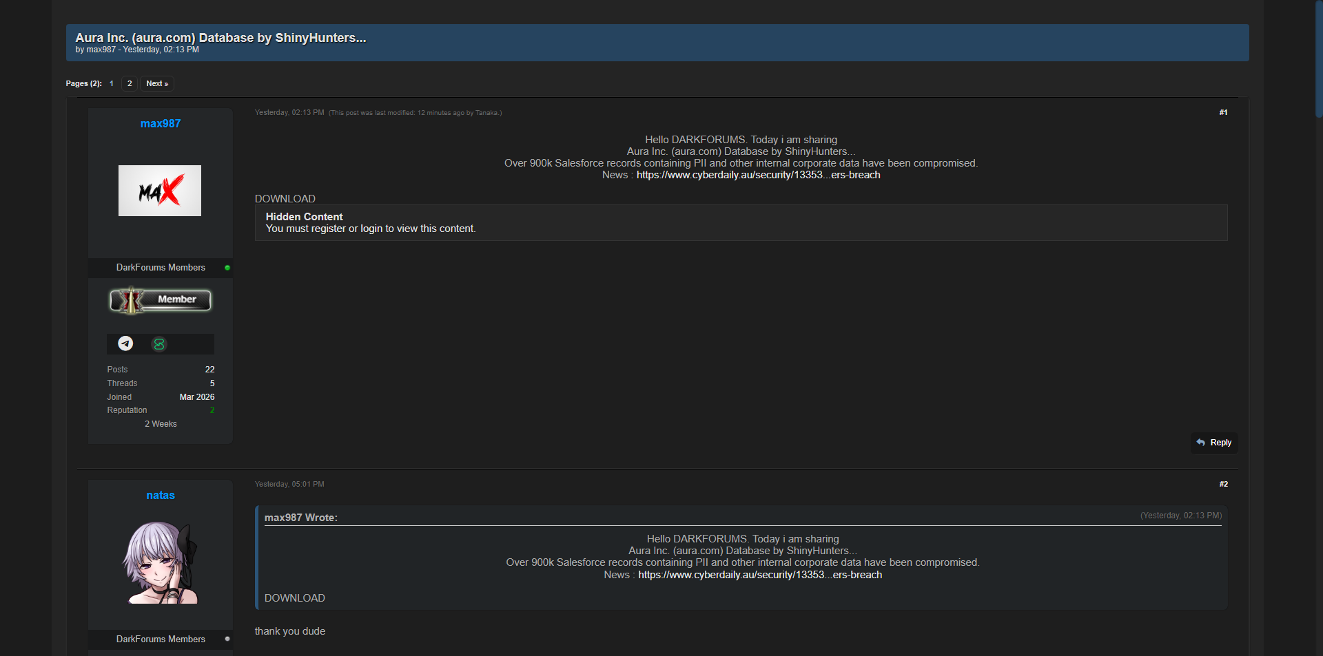 零零信安暗网新闻 | 暗网ShinyHunters泄露身份保护公司Aura Inc. 超90万Salesforce记录