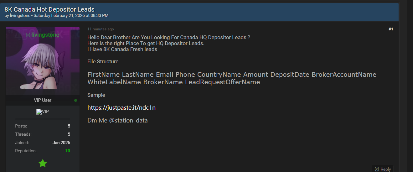 威胁行为者公开宣称,正售卖8000条(8K)加拿大存款人线索,此次泄露数据涵盖存款人个人身份、金融交易及中介关联等多类敏感信息,属于针对性极强的黑产牟利型金融数据泄露事件,对加拿大存款人资金安全、个人隐私及金融行业合规经营构成严重威胁。