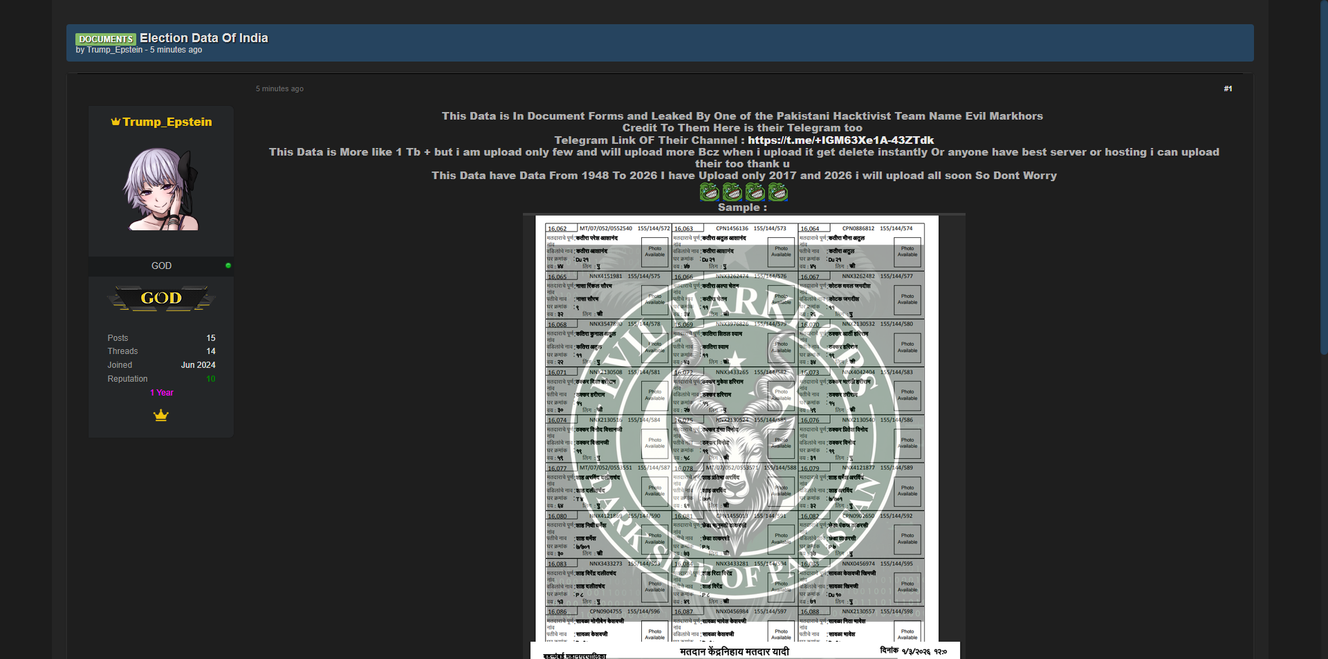 黑客论坛曝光印度选举相关海量数据,总规模超过1TB,包含从1948年至2026年的选民信息、选民照片、选区记录及选举相关文档,由巴基斯坦黑客组织“Evil Markhors”泄露并上传部分样本。