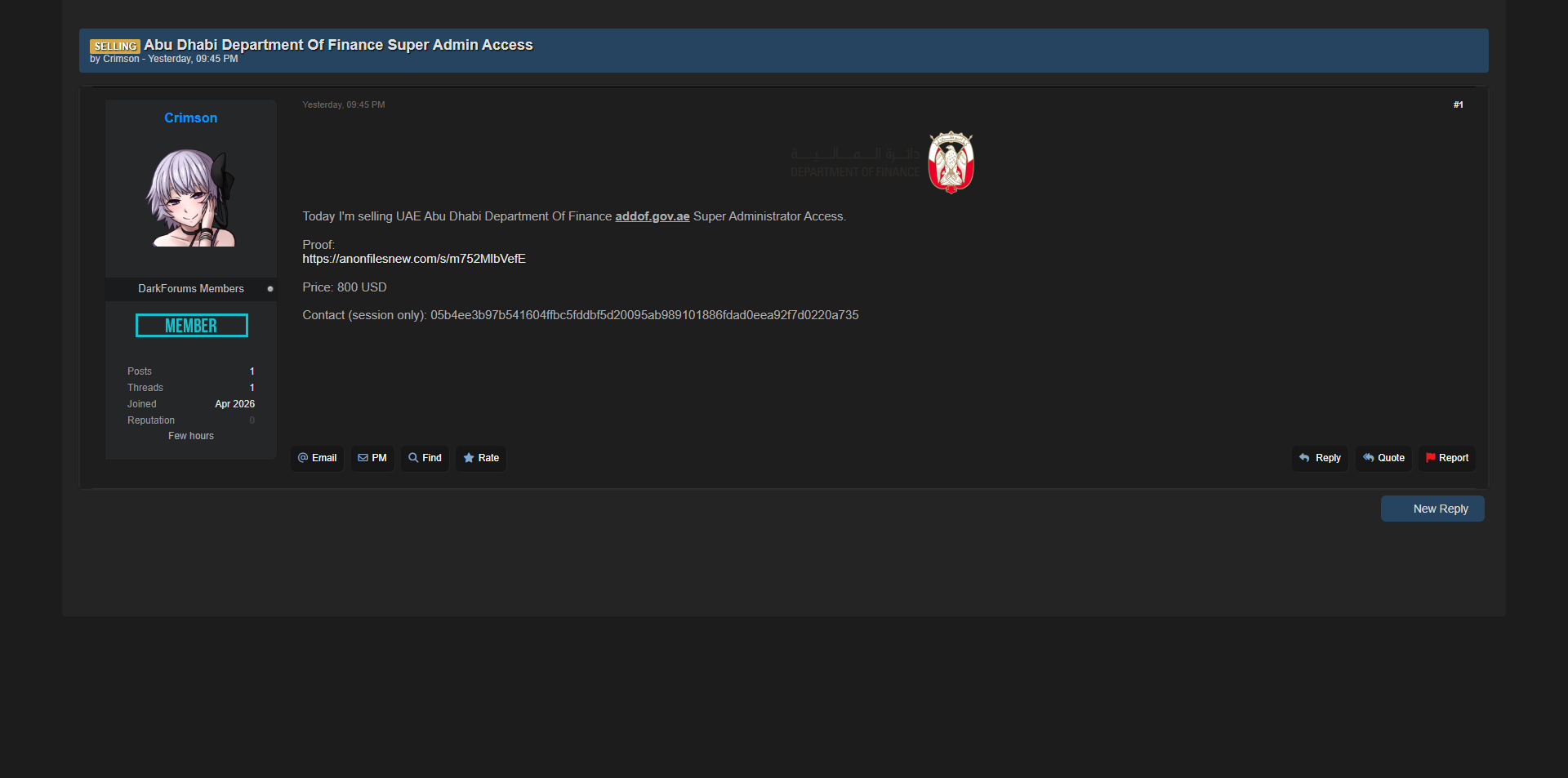 零零信安暗网新闻 | 阿联酋阿布扎比财政部超级管理员权限出售