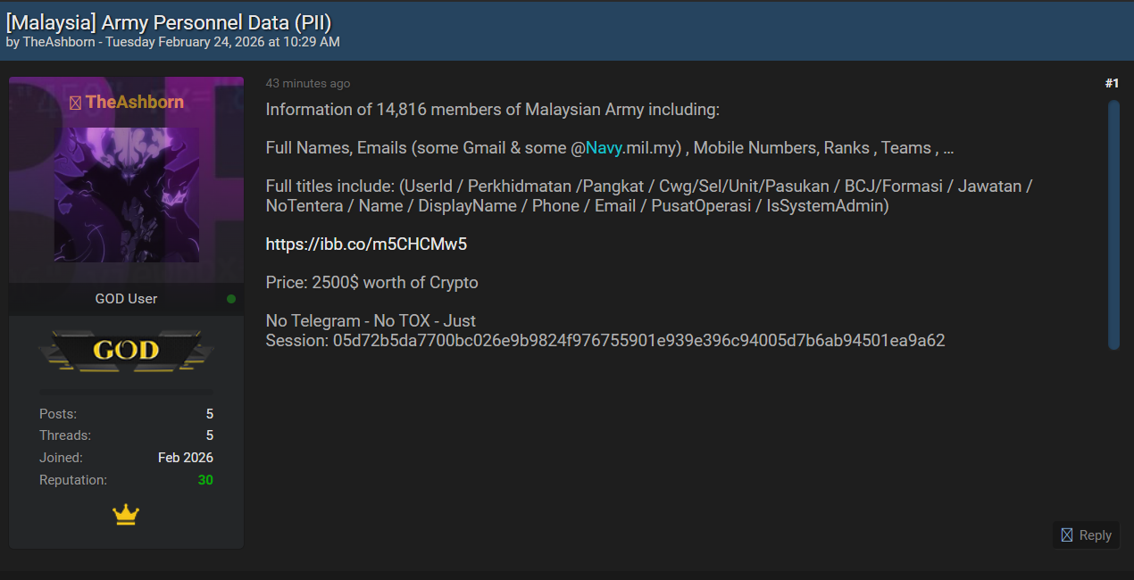 威胁行为者TheAshborn于2026年2月24日上午10:29在暗网论坛发帖,声称窃取马来西亚军队(Malaysian Army)14,816名成员的个人信息(PII),并以2500美元等值加密货币出售。