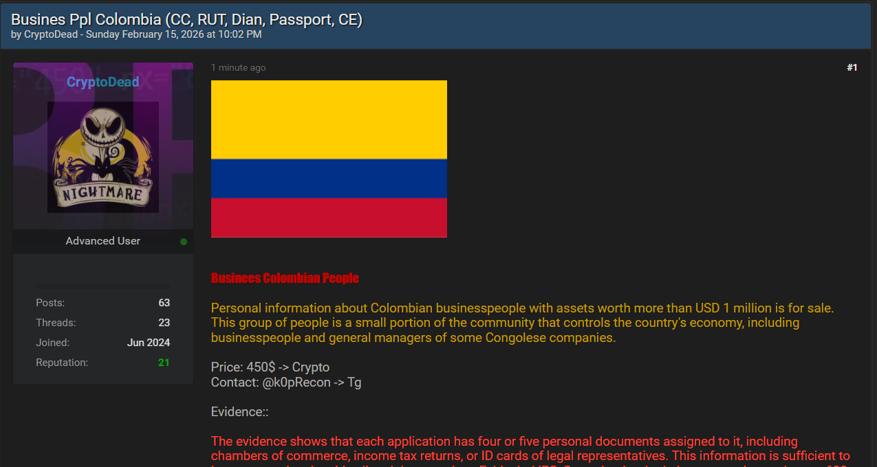 据悉,被出售的信息针对性极强,仅聚焦于资产门槛达100万美元以上的精英商人群体,该群体在哥伦比亚经济体系中占据重要地位,其个人信息及关联企业信息的泄露,可能对当地商业秩序及企业安全造成潜在冲击。此次信息出售事件中,不法分子明确标注了交易细节及相关证据,进一步证实了信息泄露的真实性。根据不法分子披露的信息,此次个人信息出售的核心细节及泄露数据详情如下,其中泄露数据类别及相关佐证以清晰列表呈现,便于明确信息范围: