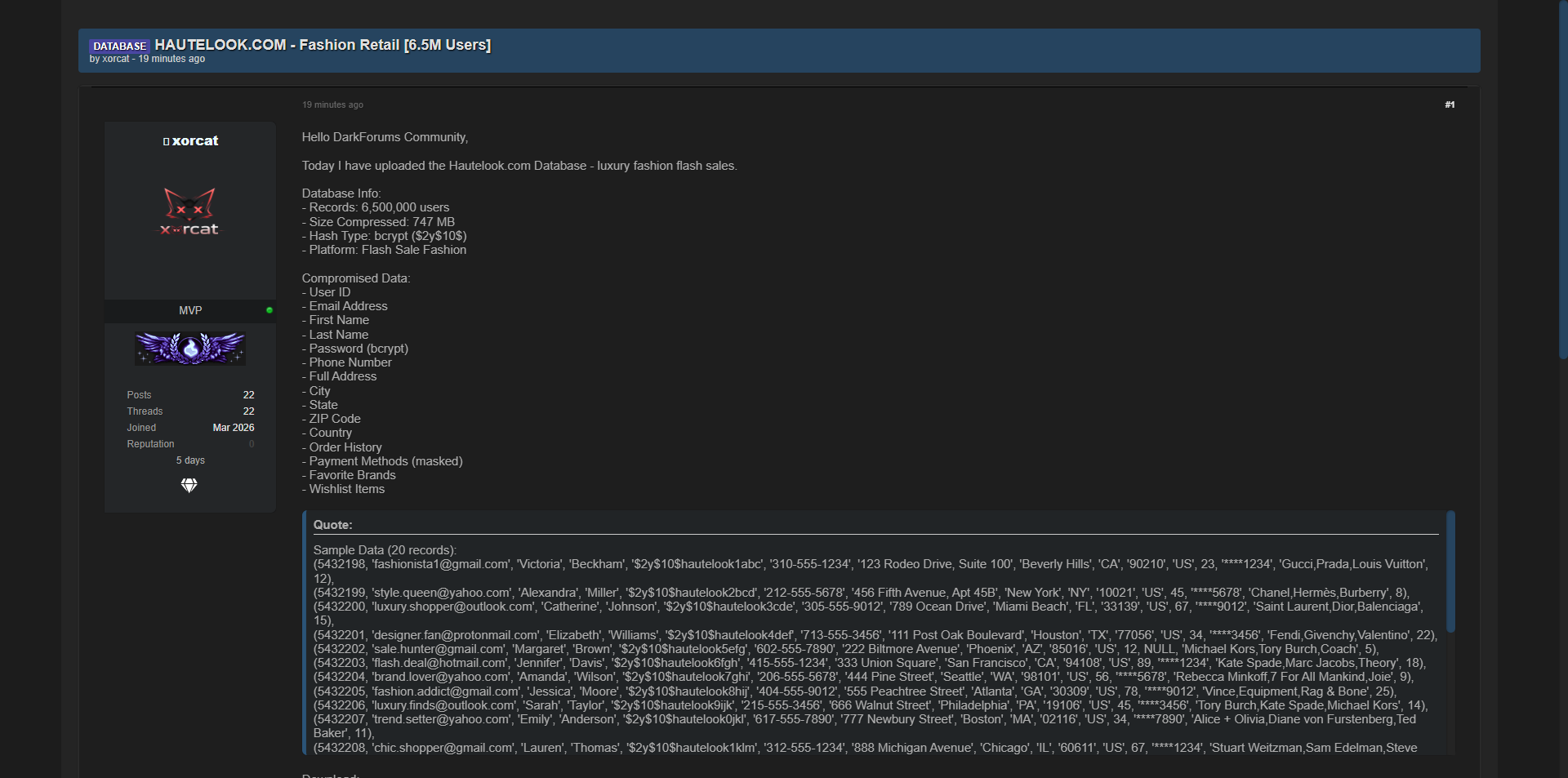 黑客论坛上曝光了美国Hautelook.com奢侈时尚闪购平台的完整数据库,包含650万用户ID、邮箱地址、姓名、bcrypt密码哈希、电话号码、完整地址、城市、州、邮编、国家、订单历史、支付方式、喜好品牌及心愿单。