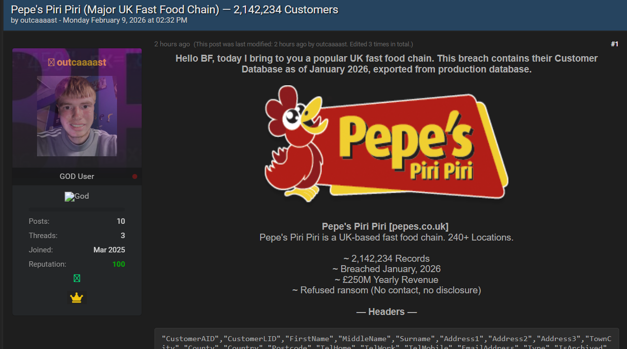 一名使用网名 “outcaaaast” 的威胁行为者发布公告,宣称已泄露英国大型快餐连锁品牌 Pepe's Piri Piri 的完整客户数据库。根据其公示信息,此次泄露包含 2,142,234 条客户记录,数据导出自该公司 2026 年 1 月的生产数据库。