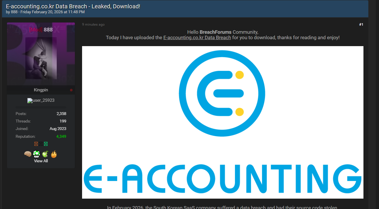 威胁行为者公开宣称,已成功入侵韩国SaaS(软件即服务)公司E-Accounting.co.kr的系统,并窃取了该公司的核心源代码。结合韩国SaaS行业特性及参考资料背景,E-Accounting.co.kr推测聚焦于会计相关SaaS服务,可能涉及电子发票开具、财务核算等核心功能,与韩国国税厅电子税政系统可能存在间接业务关联,服务于韩国本土各类企业的财务会计需求。源代码作为SaaS公司的核心资产,其被盗将对企业核心业务、技术安全及市场竞争力造成致命冲击,此次事件属于针对性强的技术资产窃取类网络攻击。