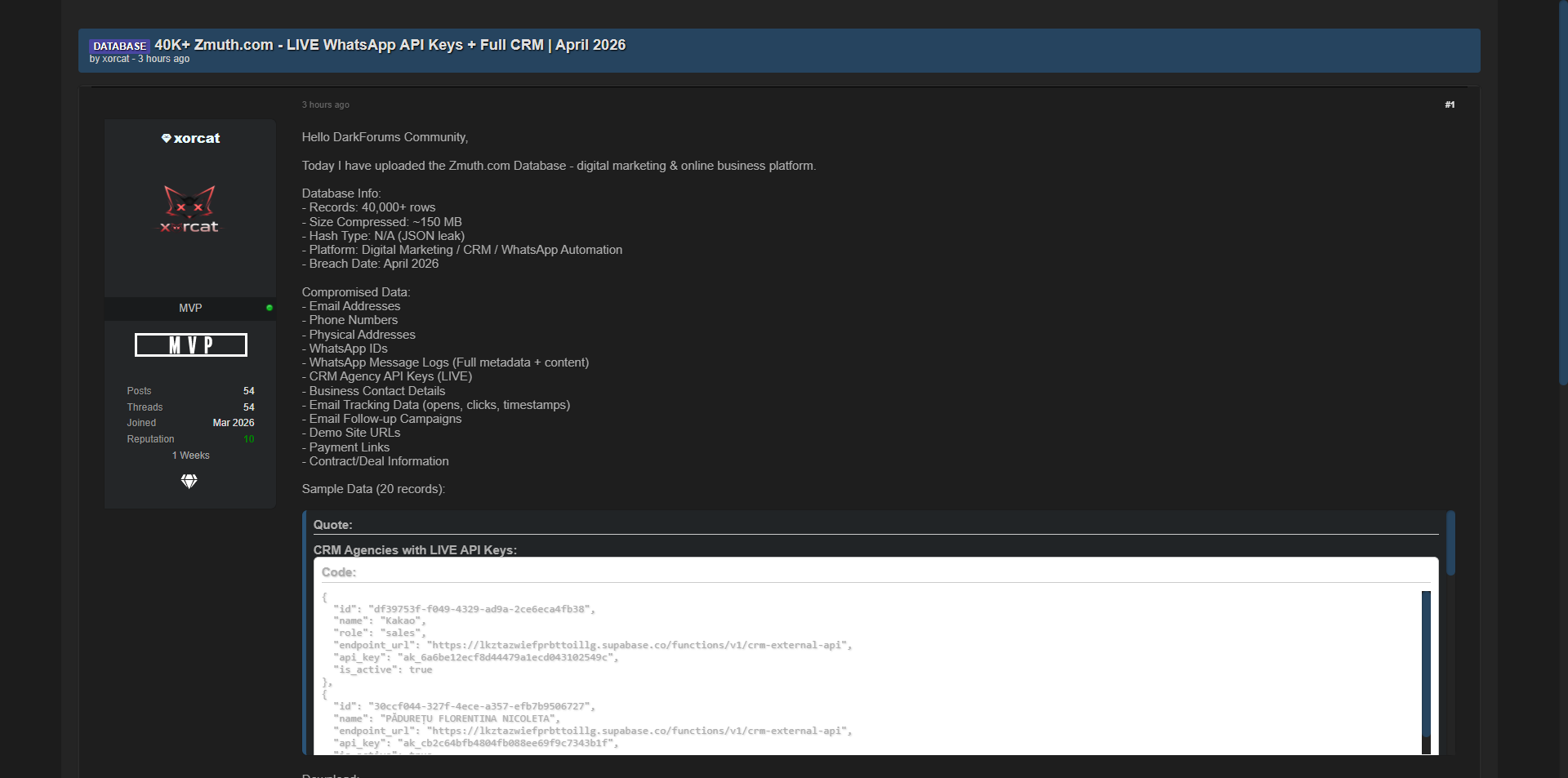 黑客论坛上曝光了罗马尼亚Zmuth.com数字营销与在线业务平台的完整数据库,包含4万+行记录、实时有效的WhatsApp API密钥以及全套CRM系统数据和WhatsApp消息日志。