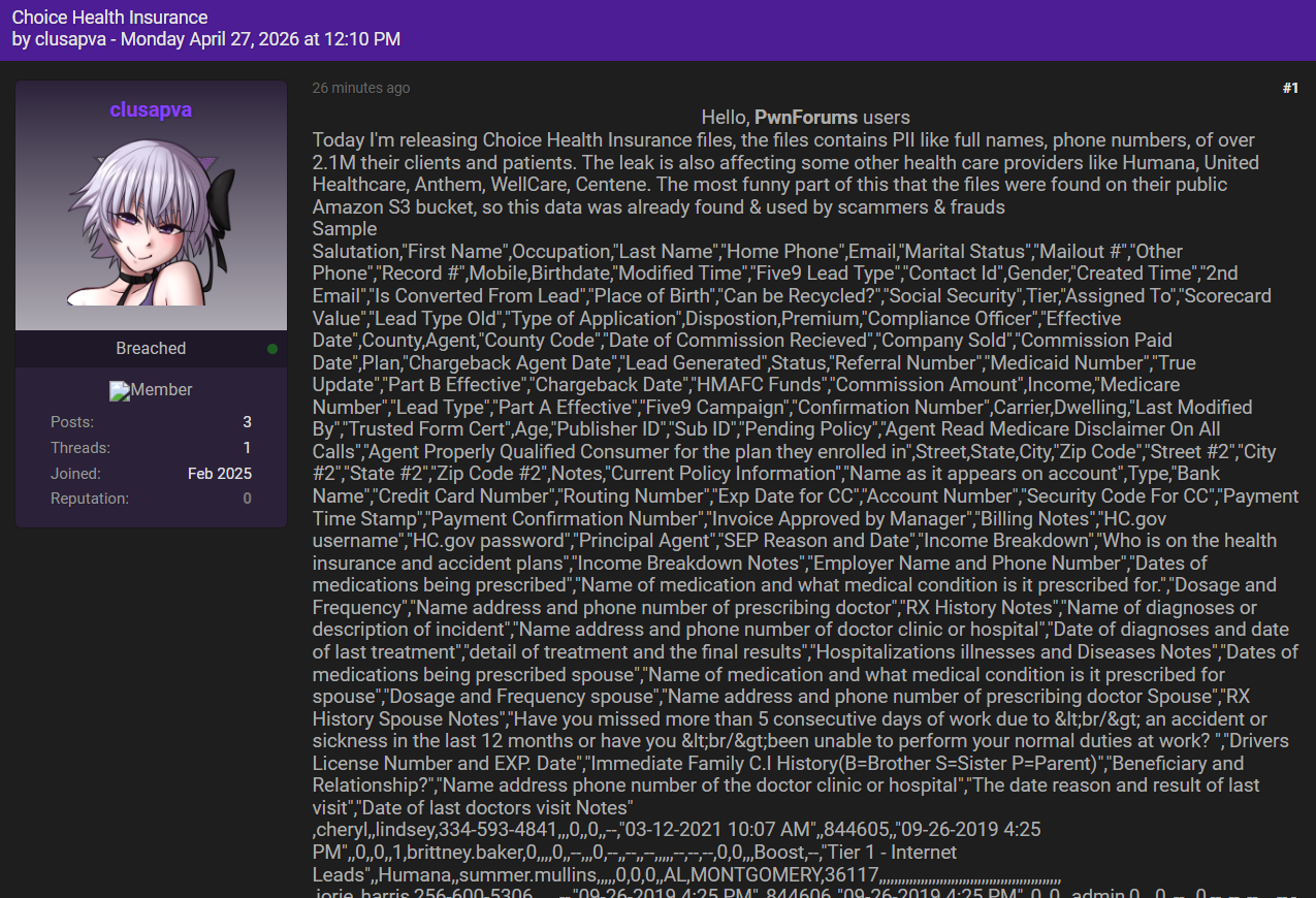 黑客论坛曝光美国Choice Health Insurance健康保险公司完整客户数据库,共超过210万条患者及客户记录。该泄露同时波及Humana、United Healthcare、Anthem、WellCare、Centene等多家大型医疗保险公司。