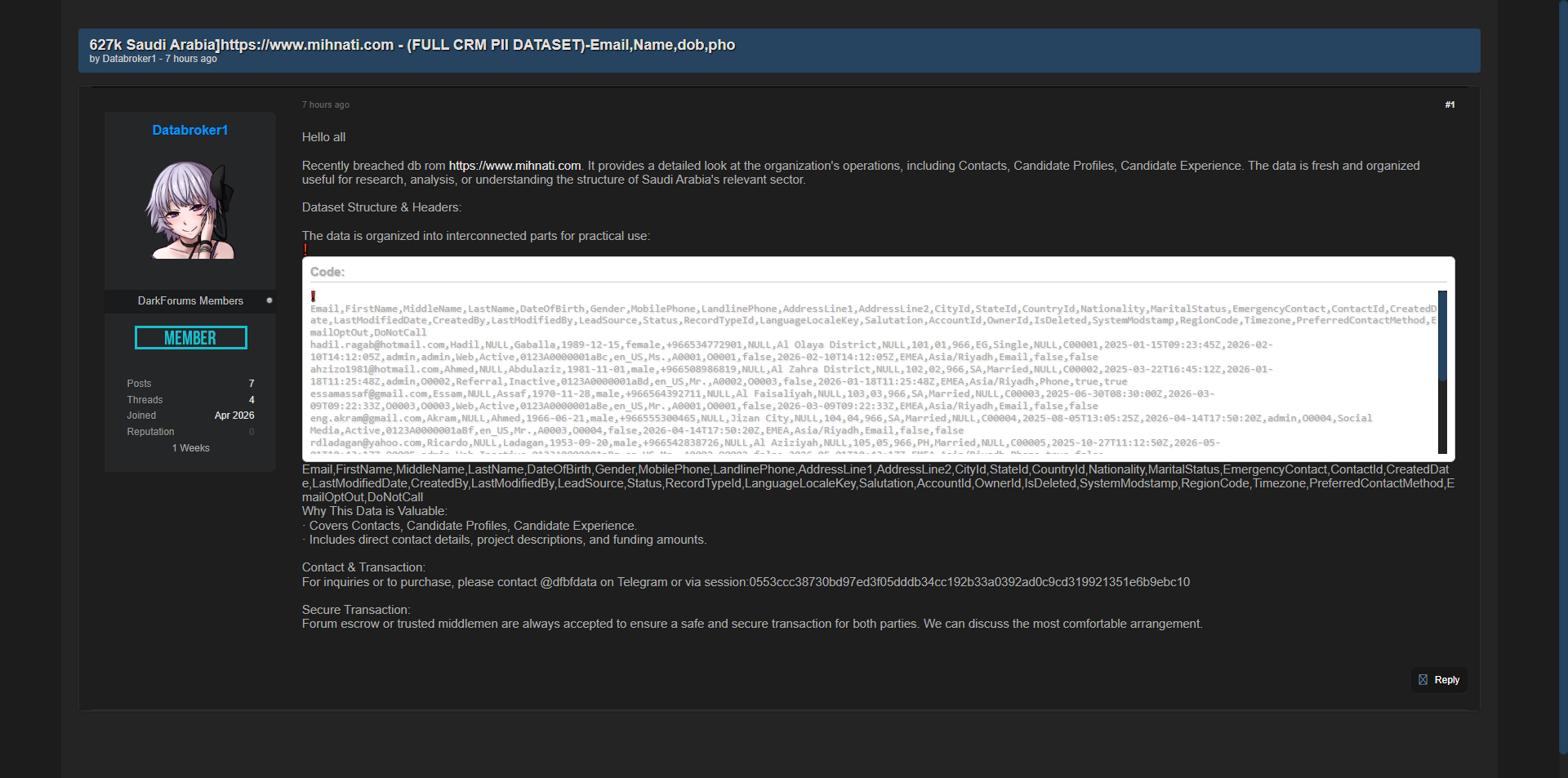 黑客论坛出售沙特阿拉伯知名招聘平台Mihnati.com完整CRM数据库,泄露约62.7万条求职者及候选人PII个人信息,包含姓名、邮箱、电话、地址、出生日期、性别等大量敏感数据。
