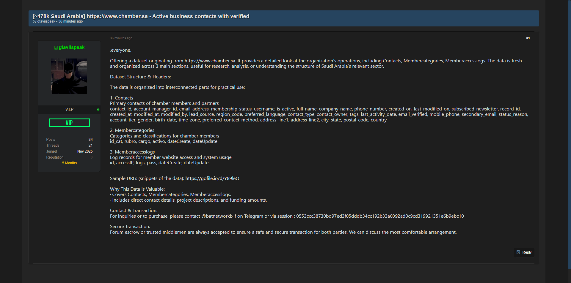 零零信安暗网新闻 | 沙特阿拉伯商会47.8万活跃企业联系人数据库泄露