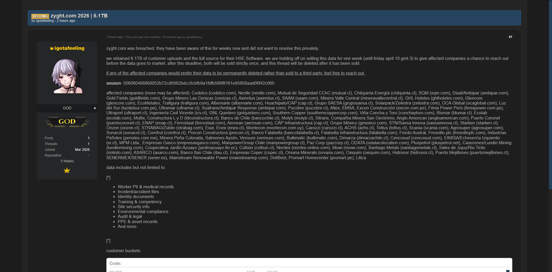 黑客论坛曝光智利zyght.com HSE(健康、安全、环境)管理软件平台的完整数据,包含6.1TB客户上传文件及完整源代码,影响多家大型矿业、能源及建筑公司。