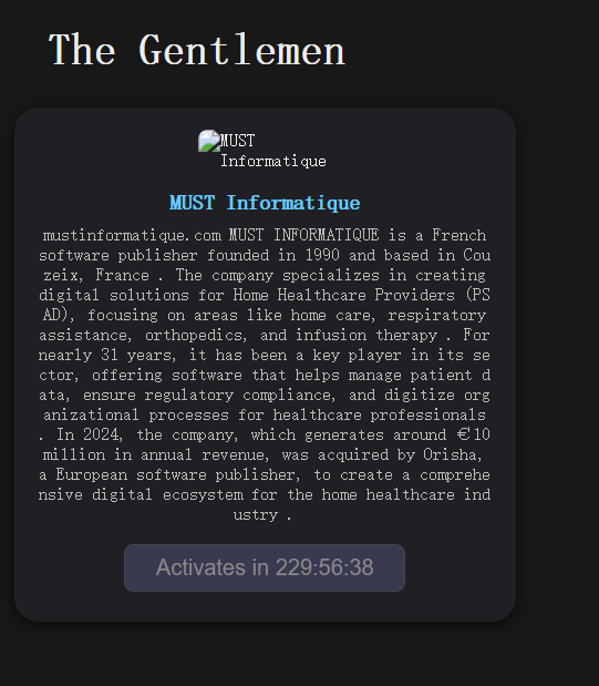 2026年2月下旬,勒索软件团伙“The Gentlemen”在其暗网泄露站点公开将法国医疗软件发行商MUST Informatique列为受害者。该公司成立于1990年,总部位于法国库泽(Couzeix),专注于为居家医疗服务提供商(PSAD)开发数字化解决方案,覆盖居家护理、呼吸辅助、骨科和输液治疗等领域。近31年来一直是该细分市场的关键玩家,提供帮助医疗专业人员管理患者数据、确保监管合规并数字化组织流程的软件。2024年公司年收入约1000万欧元,同年被欧洲软件发行商Orisha收购,以构建居家医疗行业的综合数字生态系统。