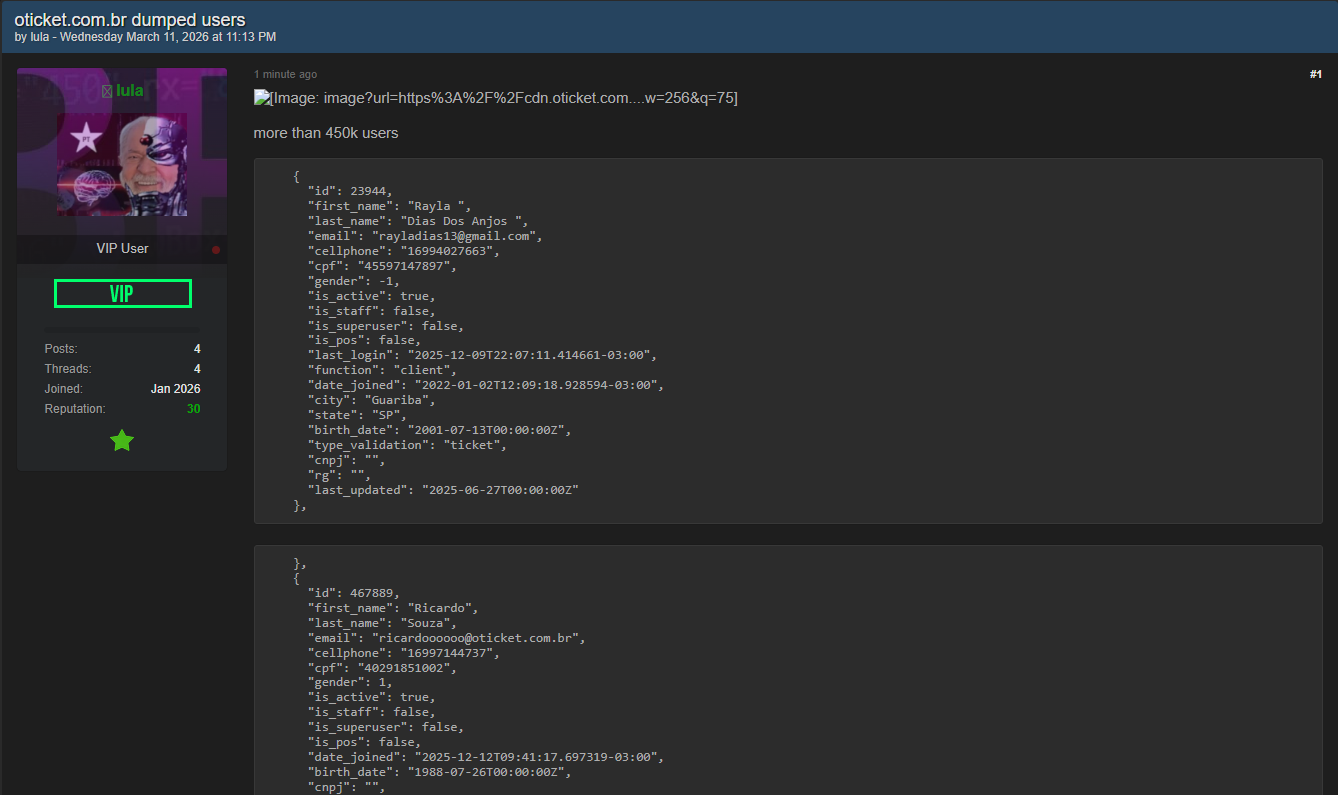 本次泄露涉及巴西票务平台oticket.com.br大量用户个人信息,泄露样本显示至少包含用户ID、姓名、邮箱、手机号等敏感字段。此类数据在传播可能导致受影响用户面临垃圾邮件、诈骗、身份冒用等风险。