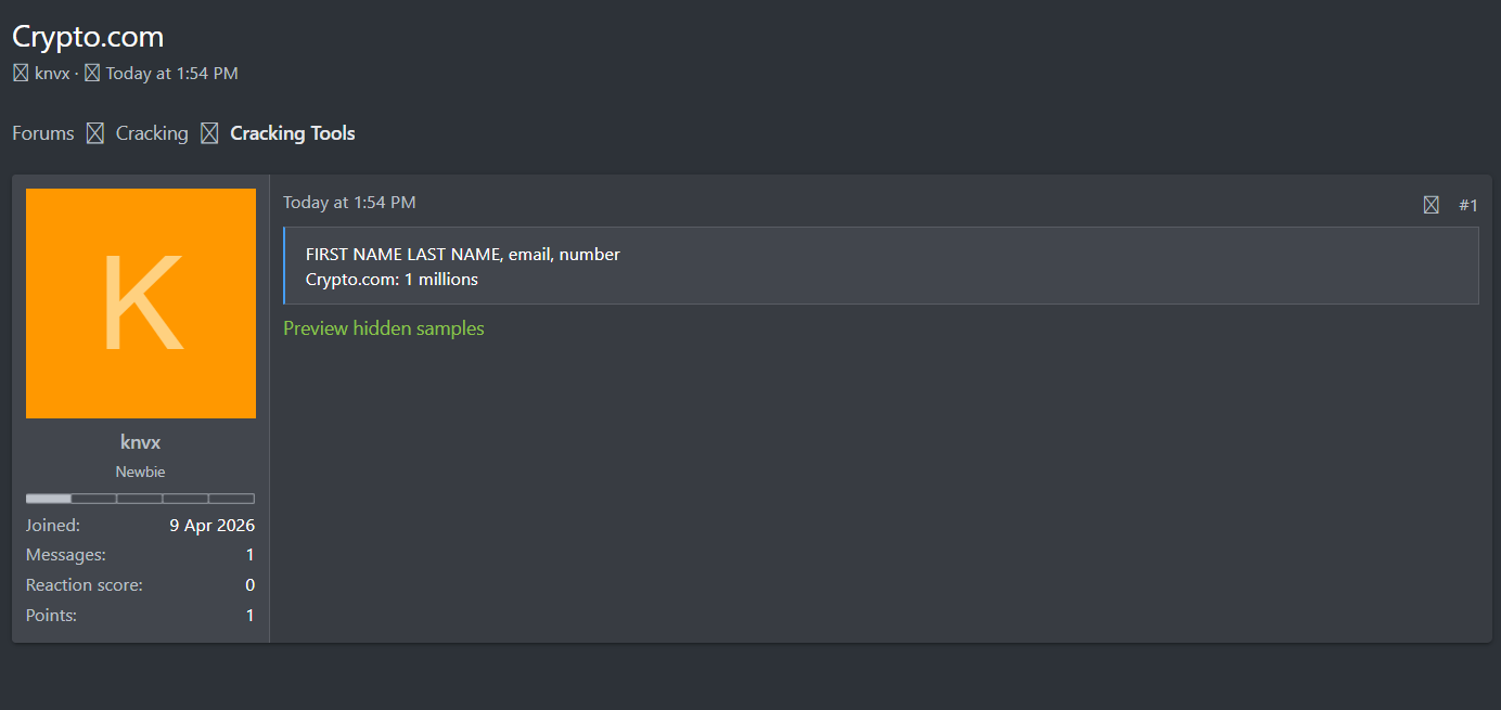 黑客论坛曝光Crypto.com平台用户数据库,泄露约100万条记录,包含大量用户姓名、邮箱地址及电话号码等个人信息。