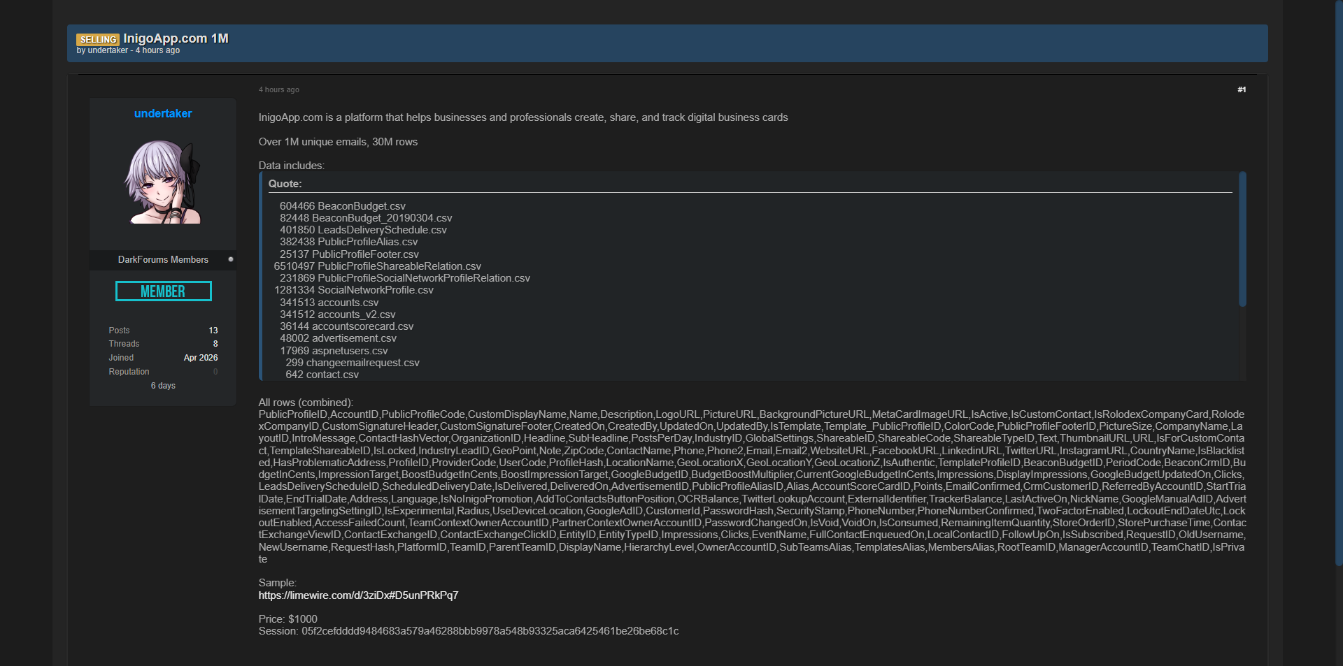 黑客论坛曝光InigoApp.com数字商业名片平台完整数据库,包含超过100万独特邮箱和3000万行数据,泄露了大量企业和专业人士的数字名片及商业联系信息。
